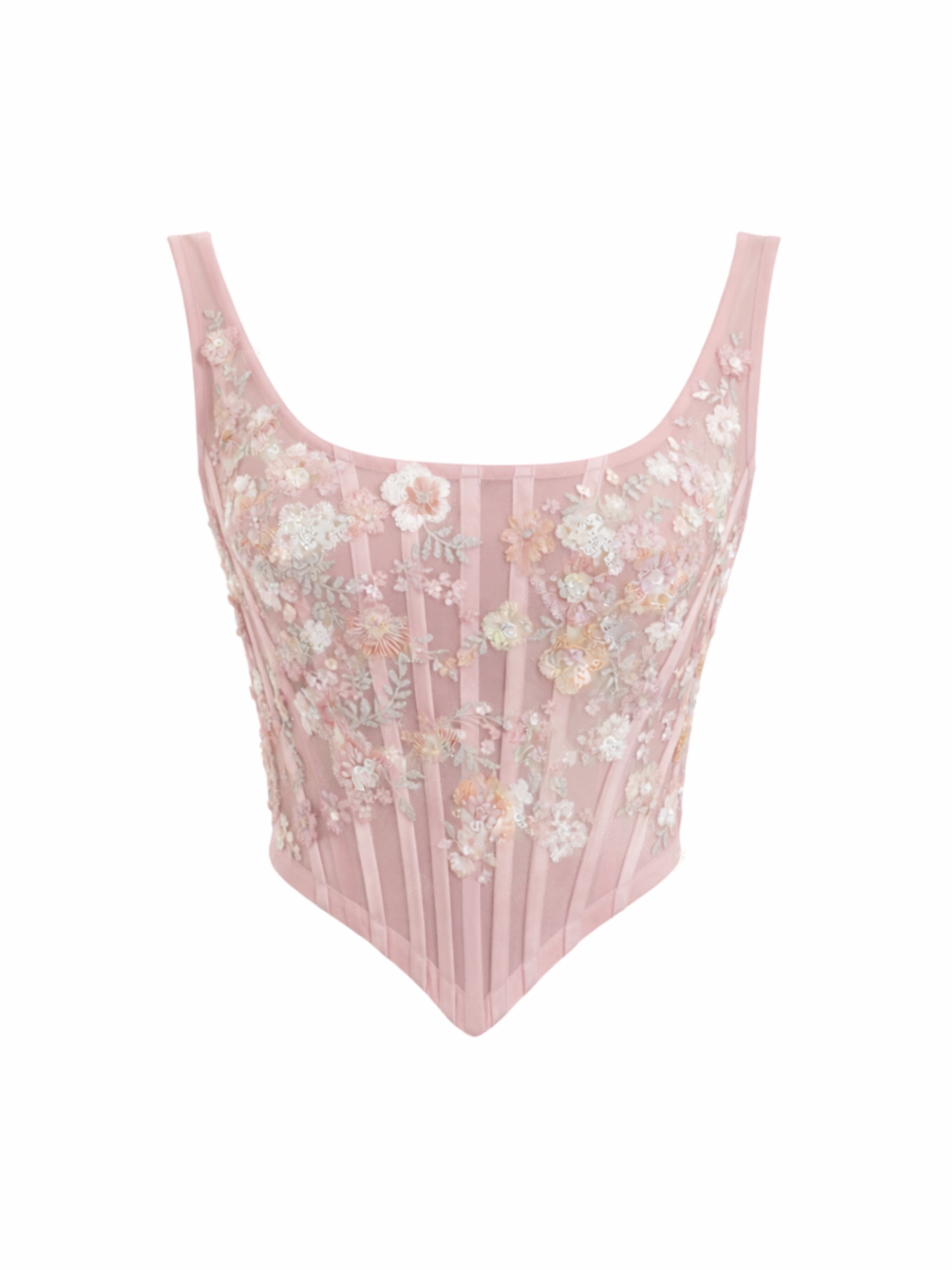 Features internal boning, sheer panels, built-in nude cups, and adjustable back lacing for a customized fit.