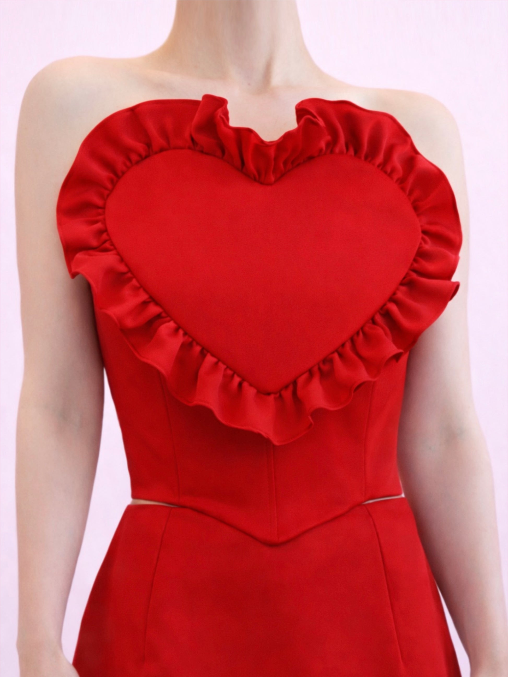 Strapless corset-style top with a heart on the front, designed as a versatile and transformable piece.