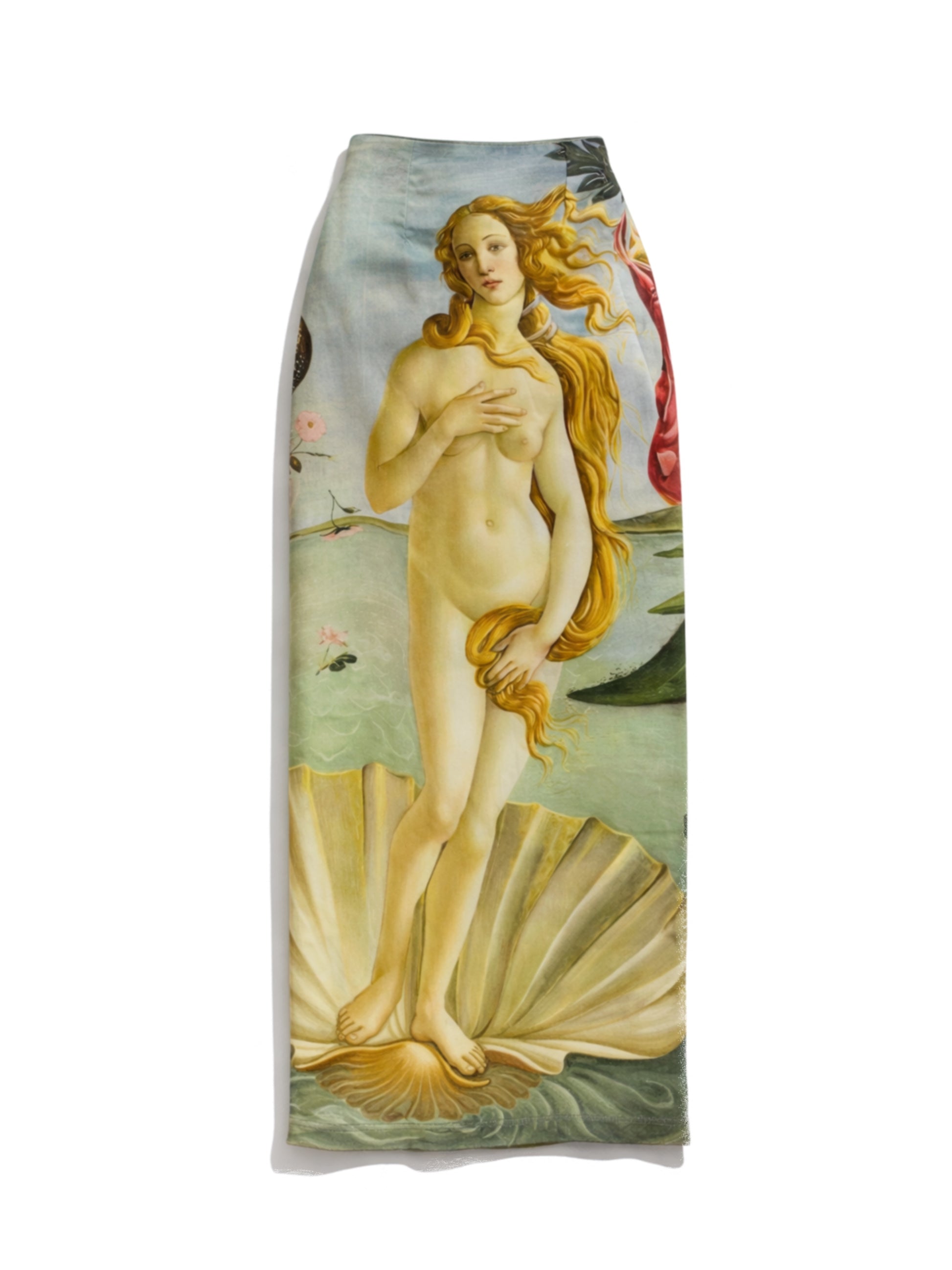 A straight skirt made of satin charmeuse with lining, inspired by Botticelli's painting The Birth of Venus.