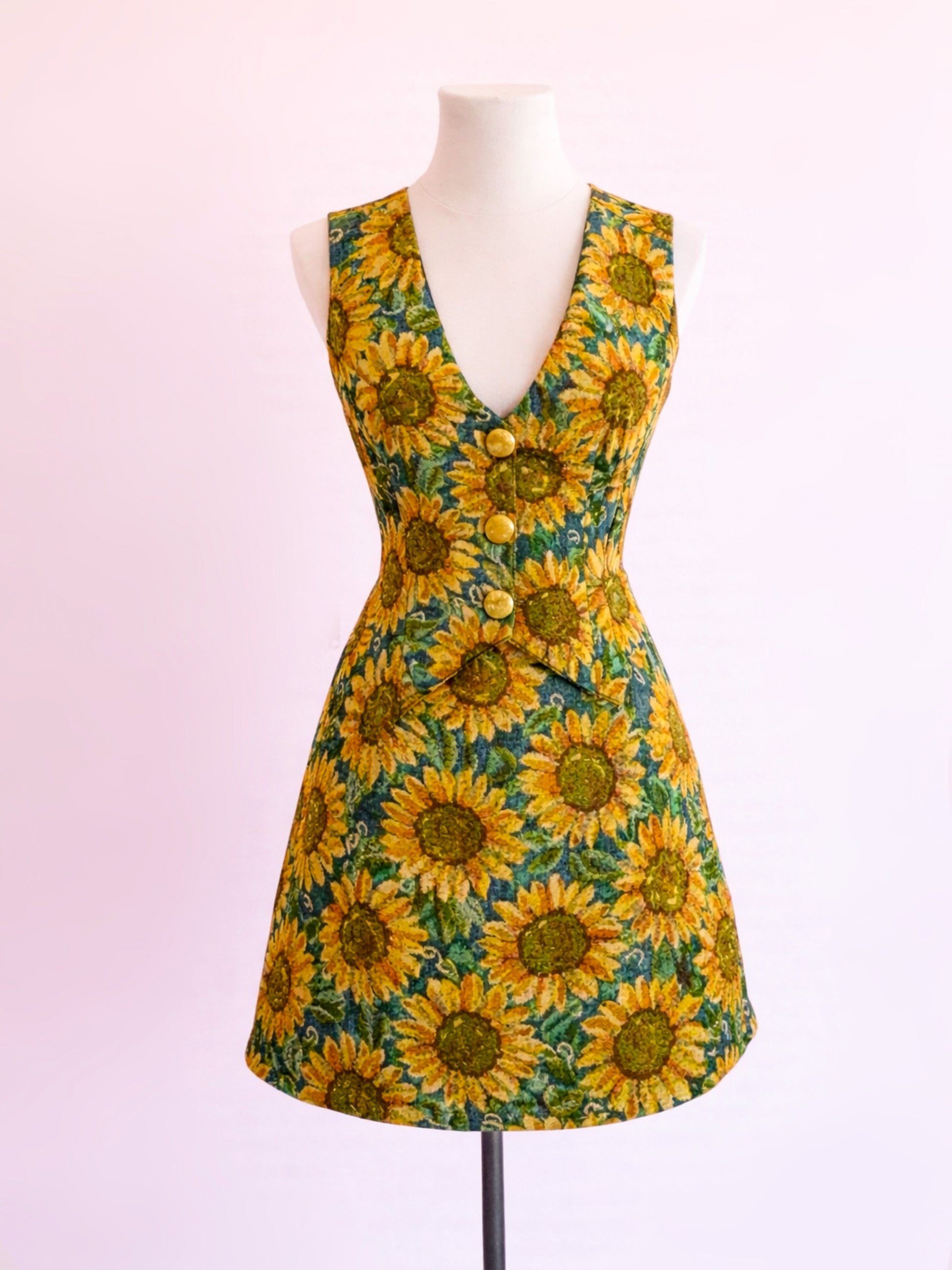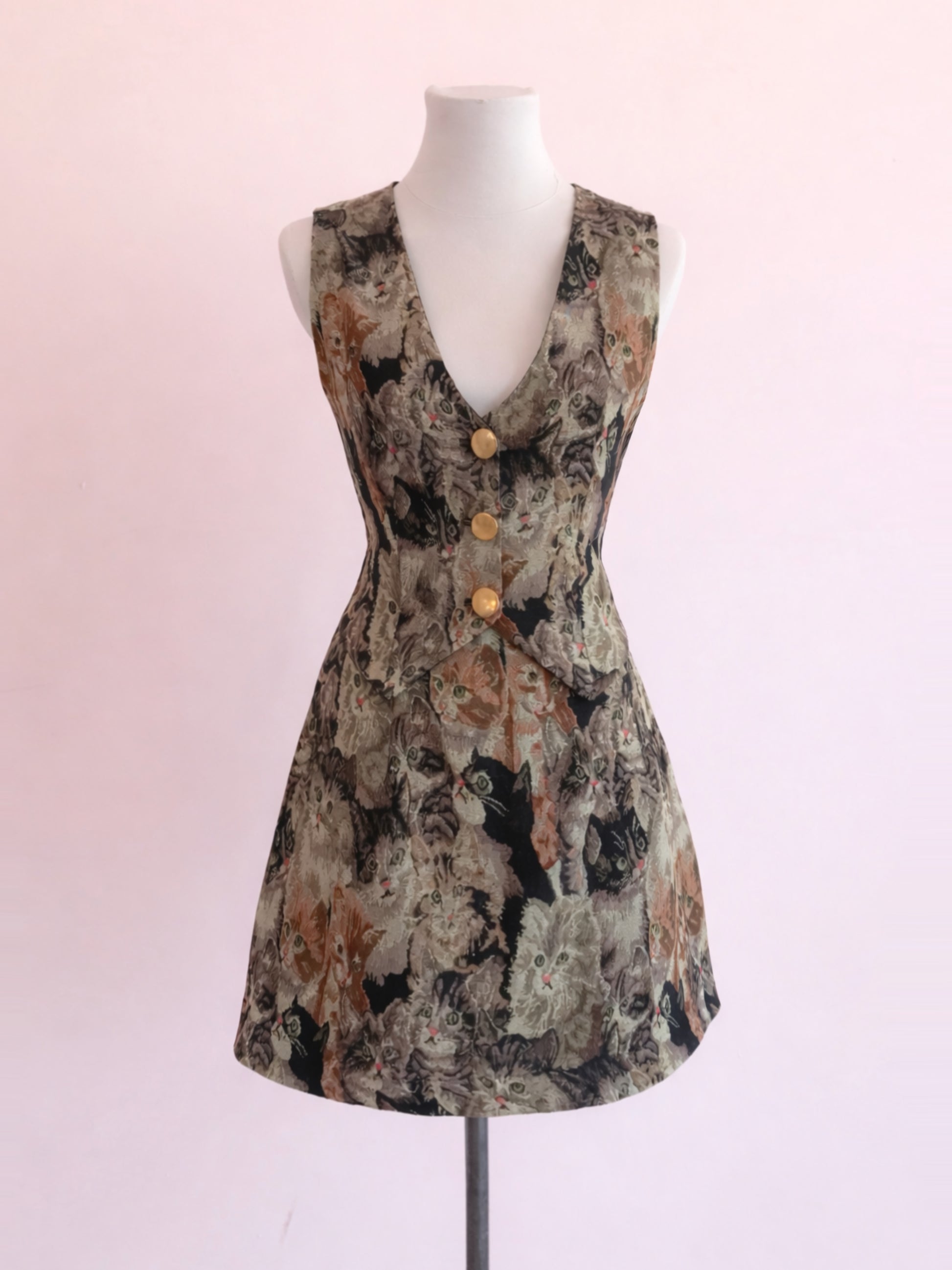 Set made of tapestry with a choice of two prints: kittens or sunflowers. The skirt includes functional pockets and an invisible zipper closure in the back, with a length of approximately 45 cm. The vest has buttons down the front, a satin back, and an inner lining. The shirt shown in the photos is not included.