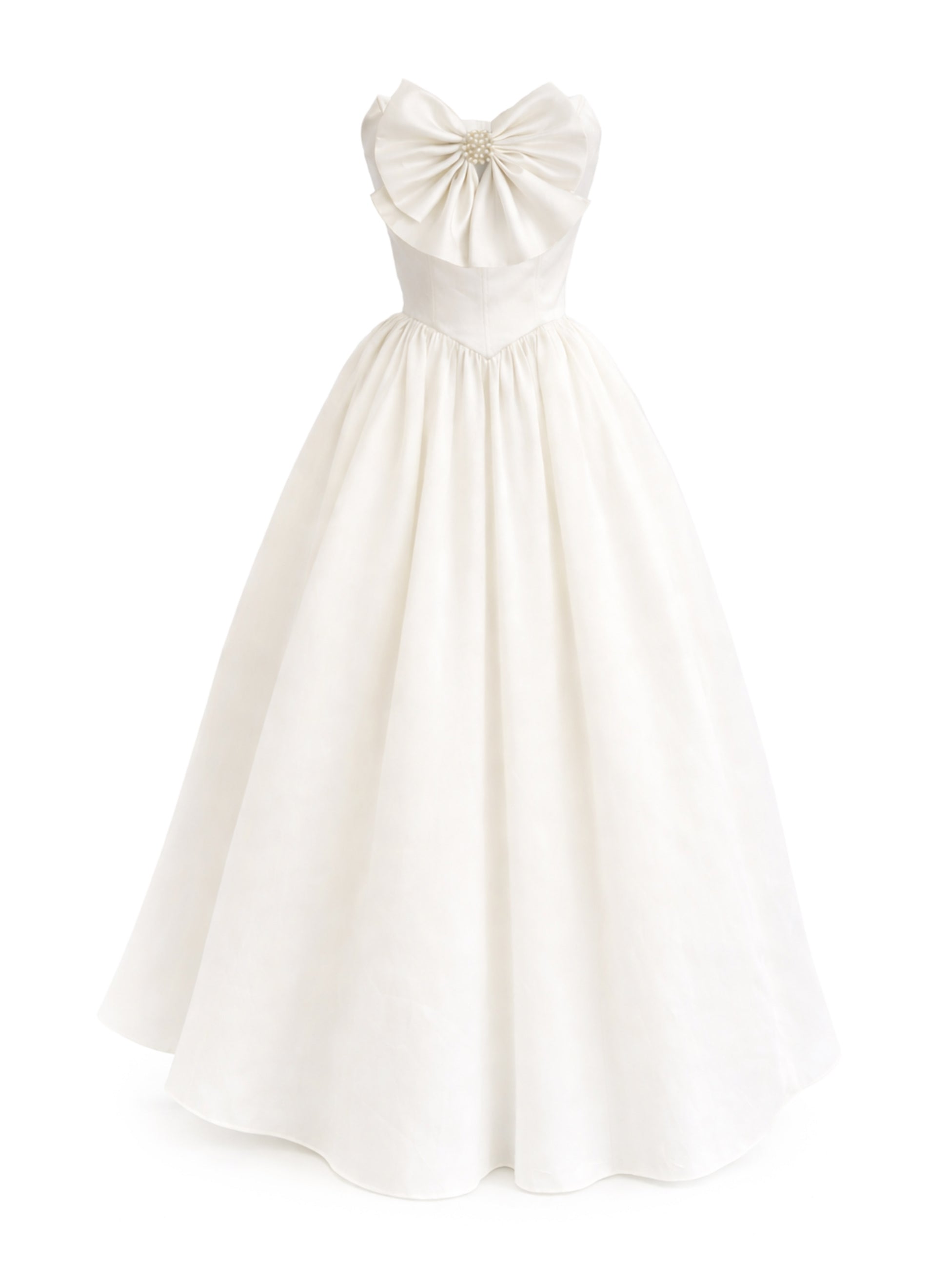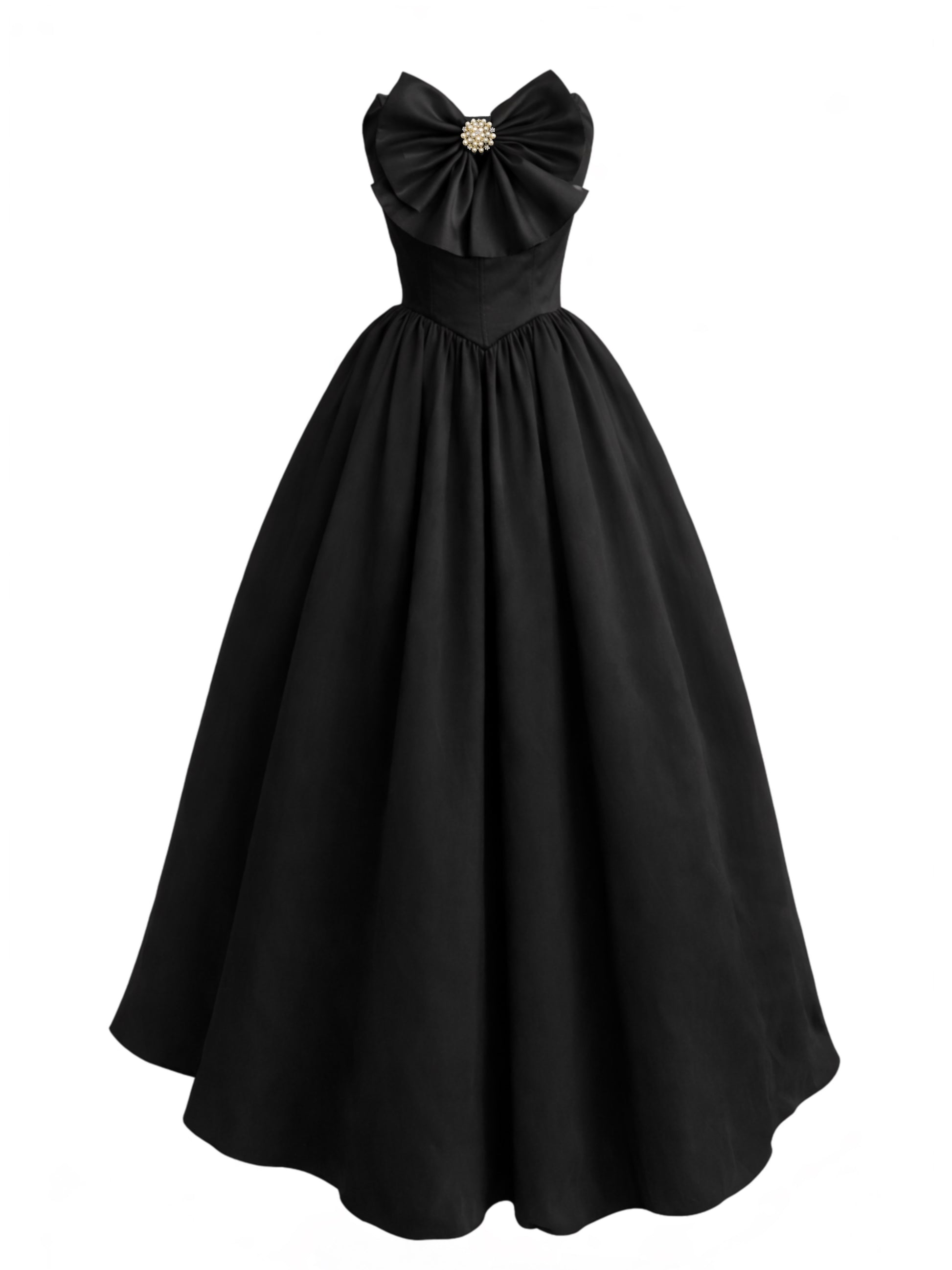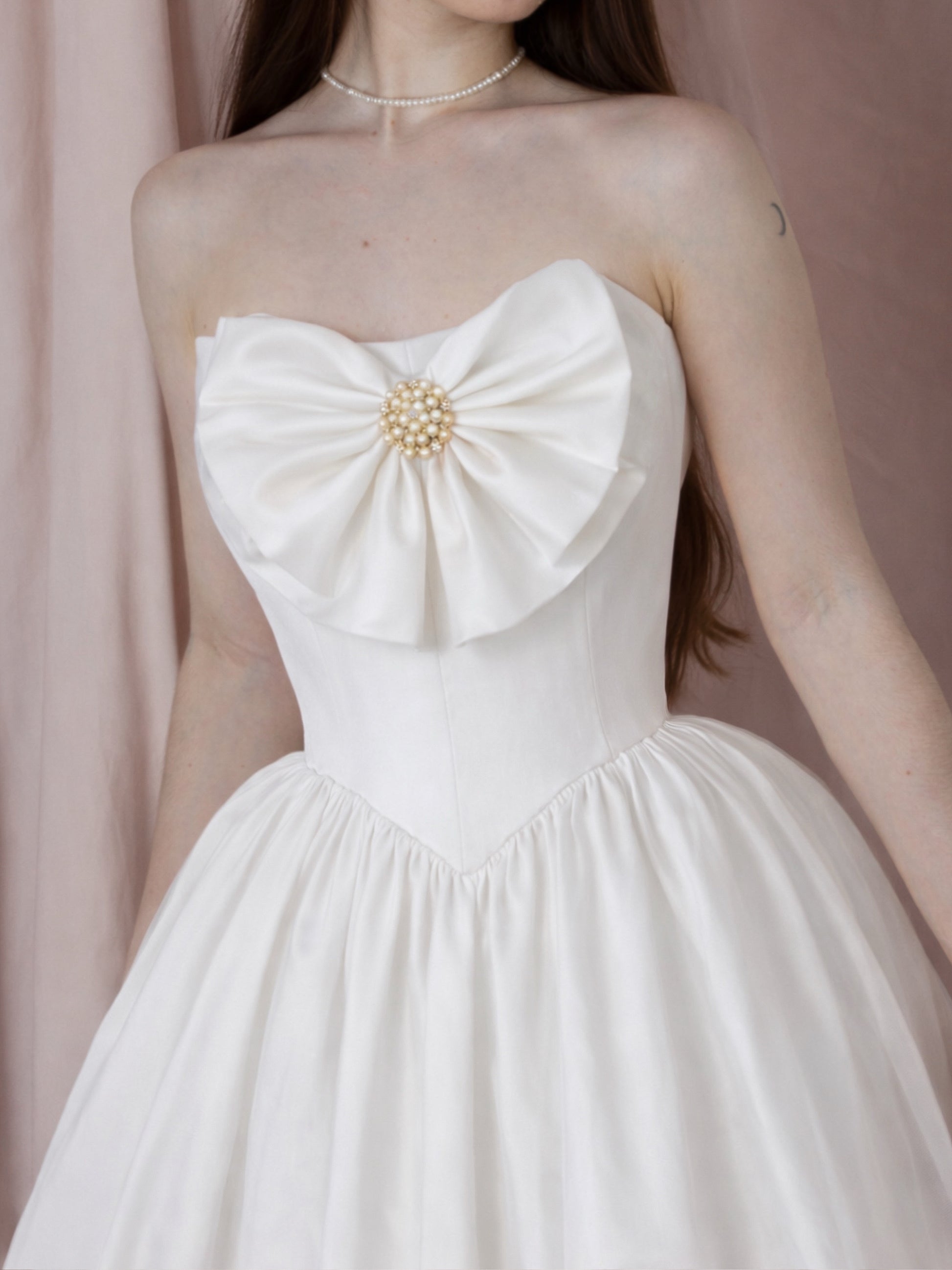 Vestido de silueta femenina y estructurada con top tipo corset de escote recto y cintura basque, diseñado para estilizar el torso. El corset cuenta con cierre de cintas ajustables en la espalda, permitiendo un ajuste personalizado. Al frente incorpora un moño decorativo con prendedor de perlas y cristales como detalle central de la pieza.