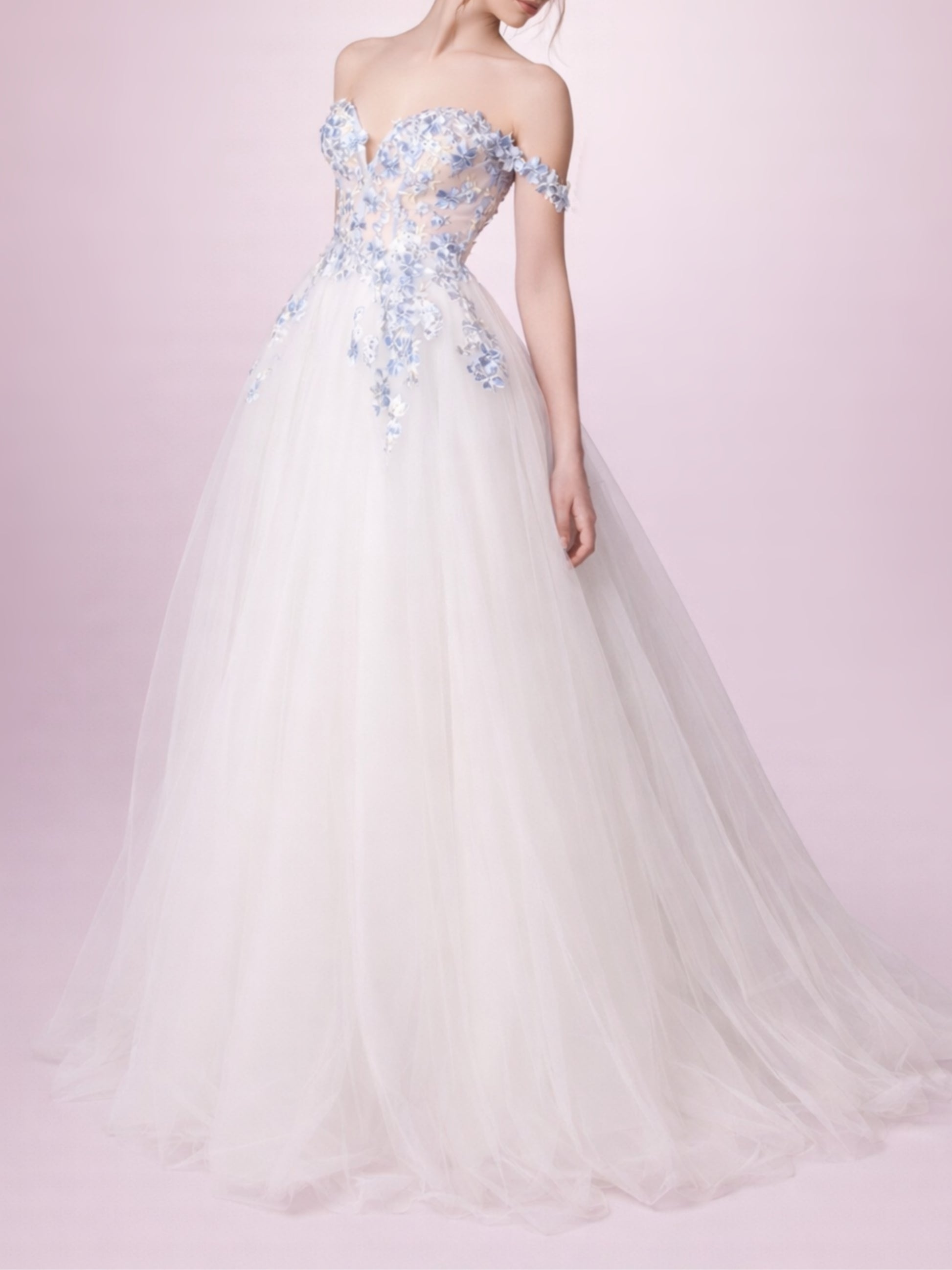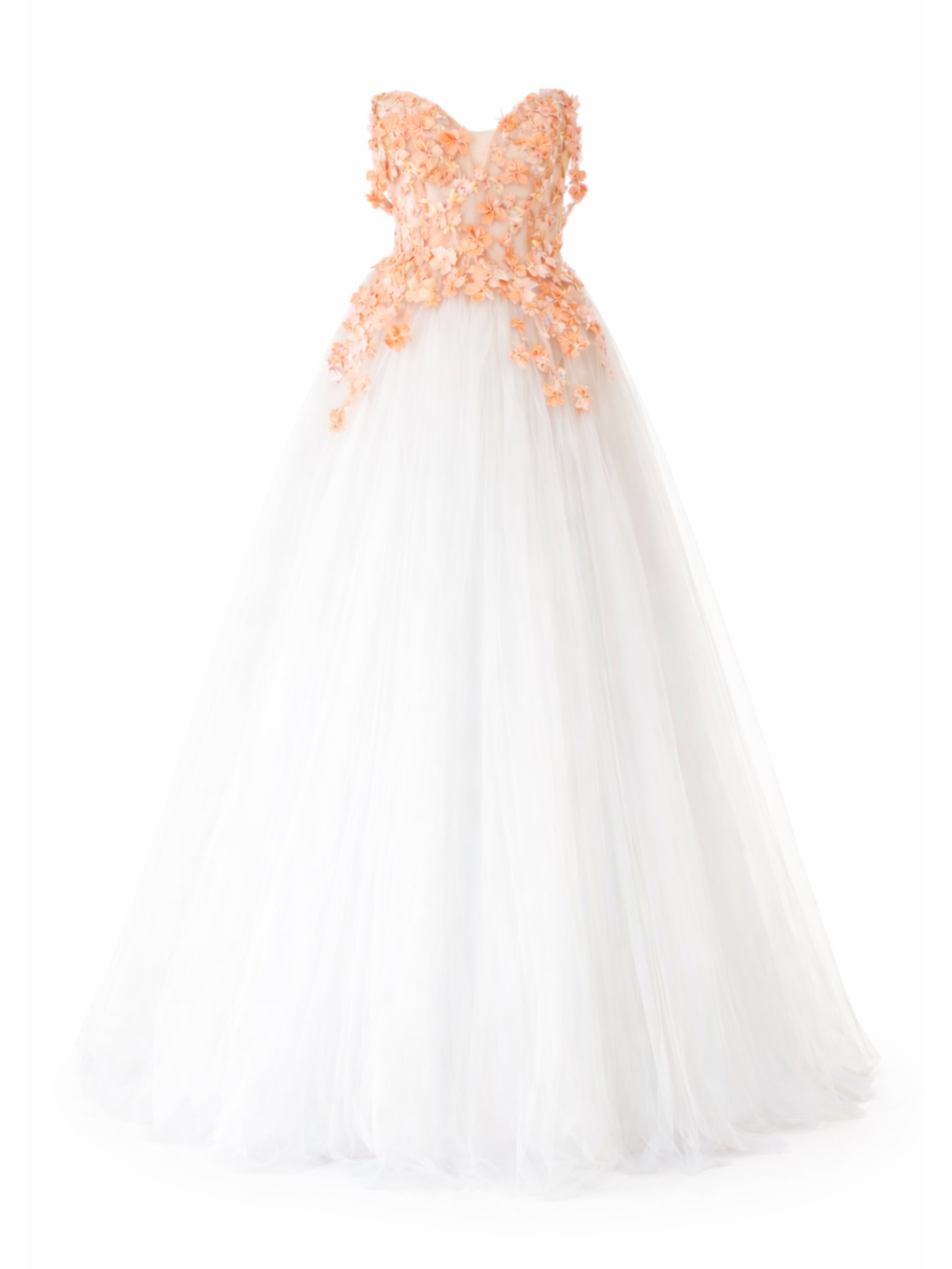 Tulle dress with embroidered flowers and adjustable ribbons at the back. The top is sheer with built-in cups and the straps are worn off the bottom.