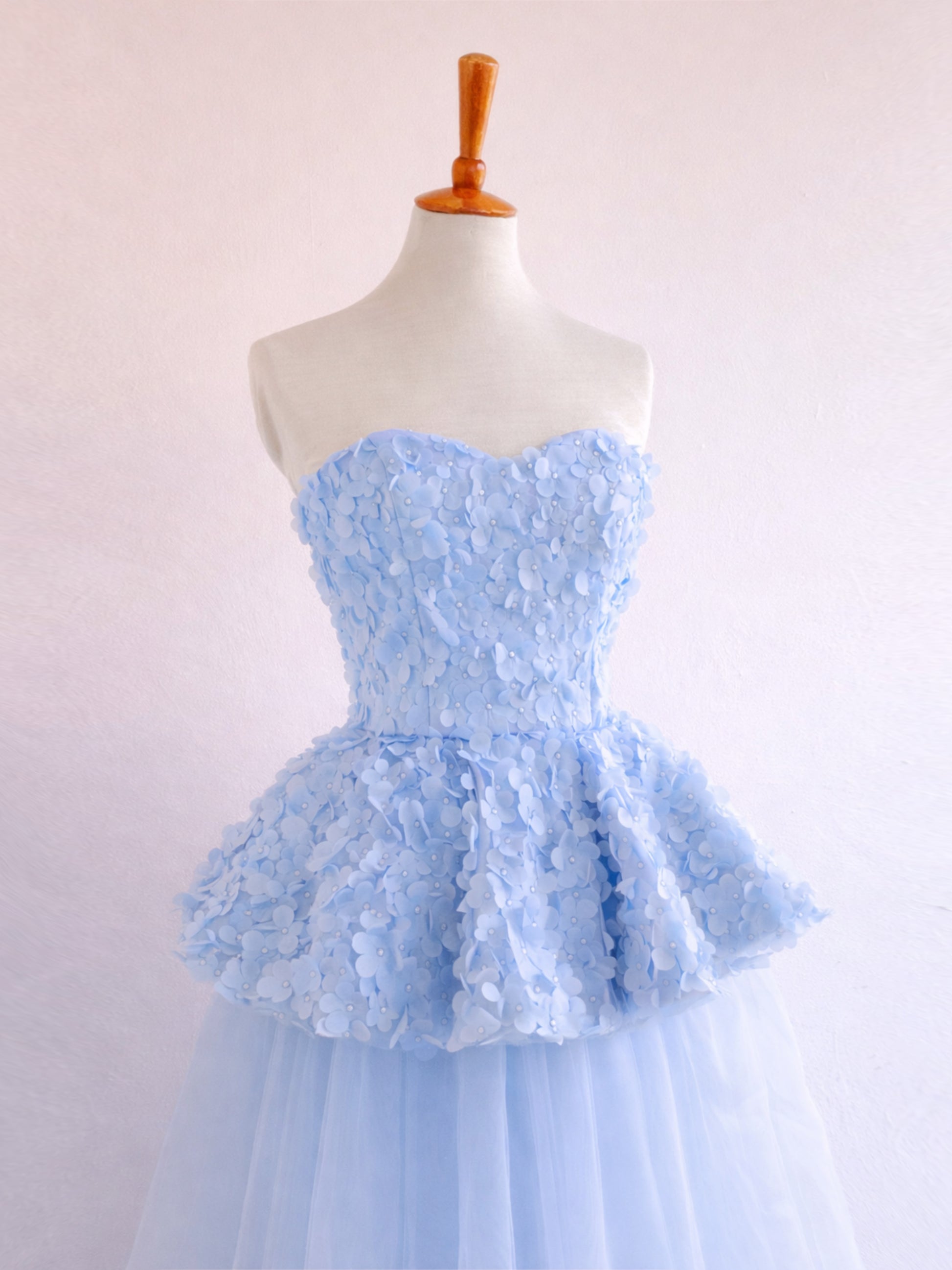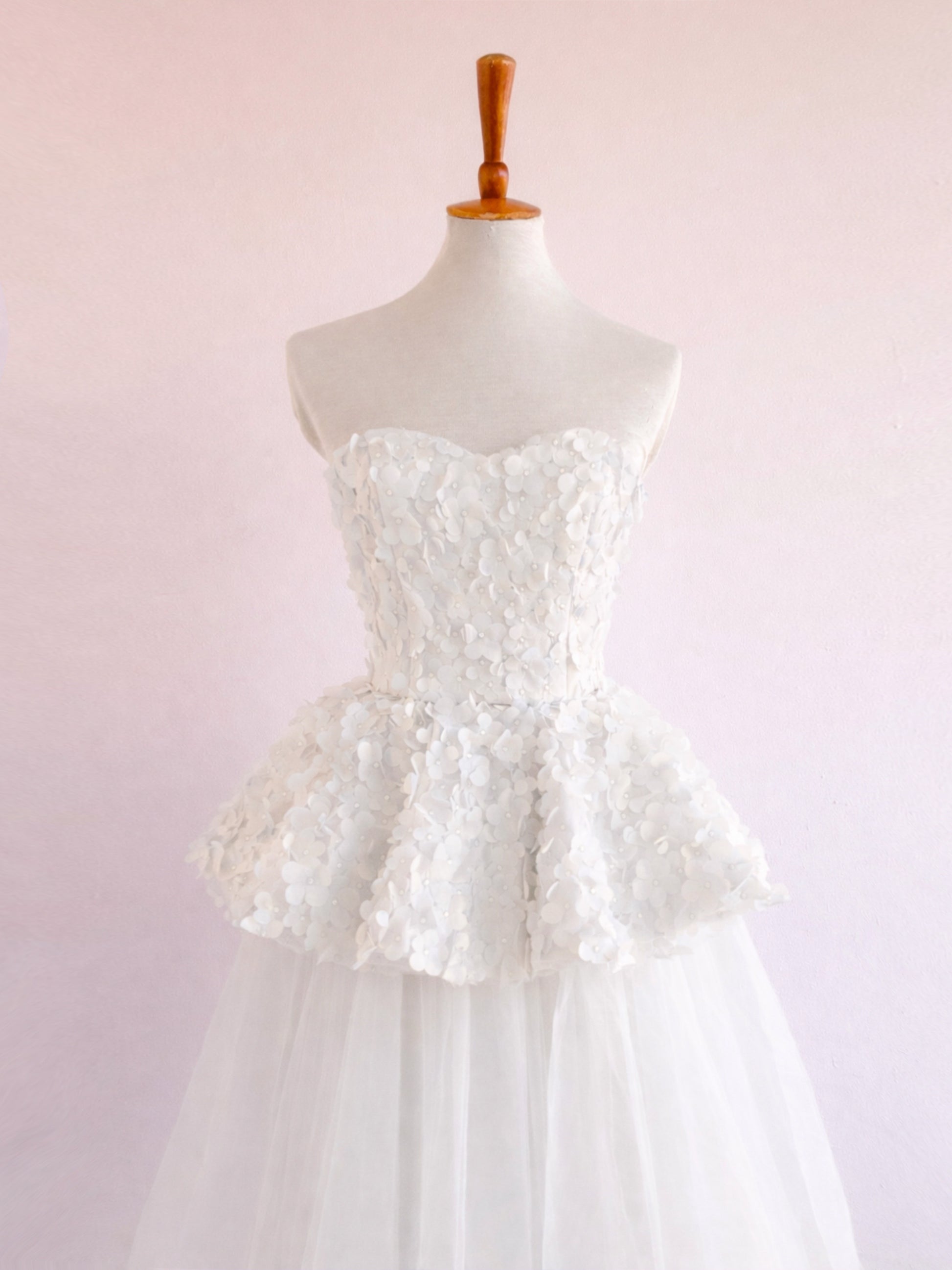 Set that includes a 3D floral peplum top with adjustable straps at the back. It has the option of being worn strapless, with removable straps or with removable sleeves. The skirt is made of illusion tulle with a charmeuse bottom and lining, with a back closure. Available in three lengths: short, midi and long.
