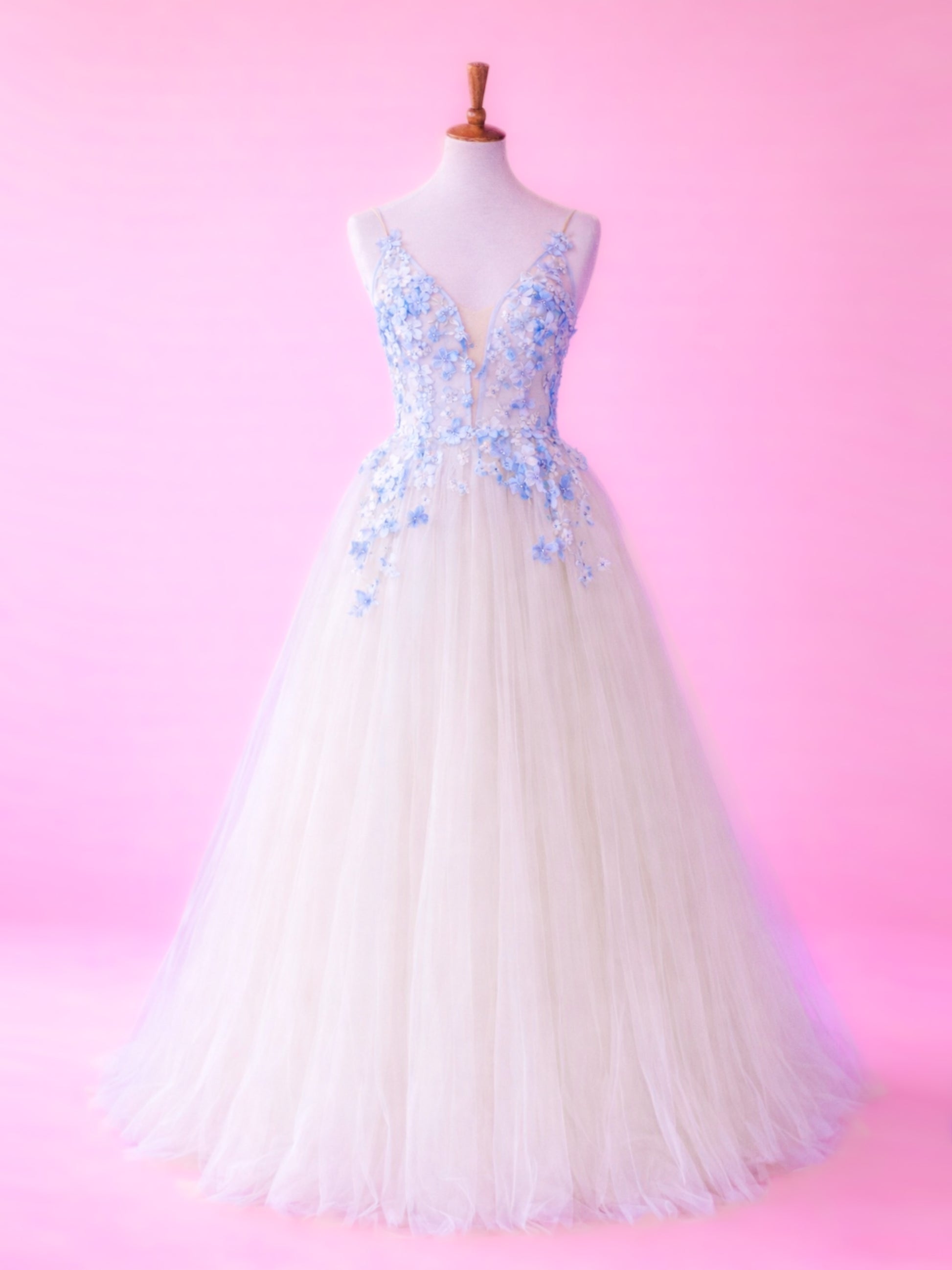 Available in sky blue or ivory with blue flowers, ideal for brides looking to subtly incorporate something blue.