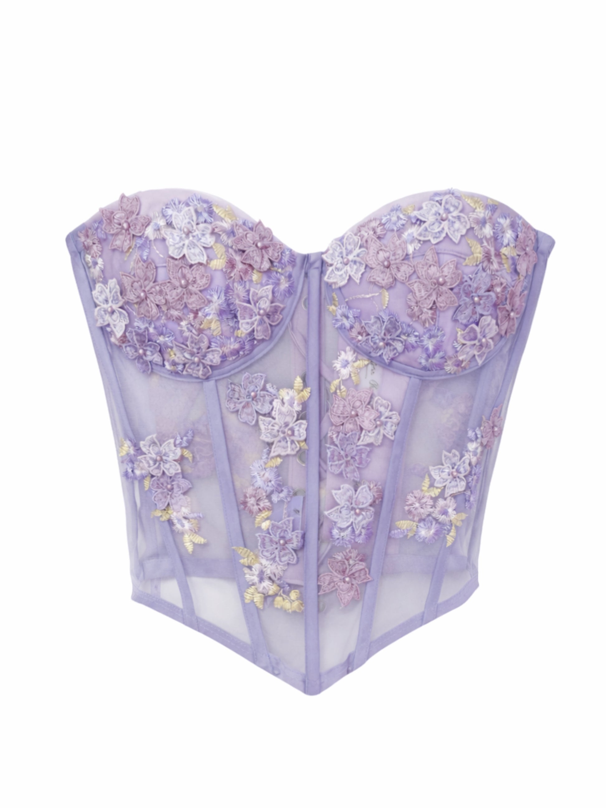 Bustier confeccionado en raso con tul óptico y aplicaciones bordadas de hortensias. Cuenta con pico en el frente, tirantes removibles y cintas ajustables en la espalda para un ajuste personalizado.