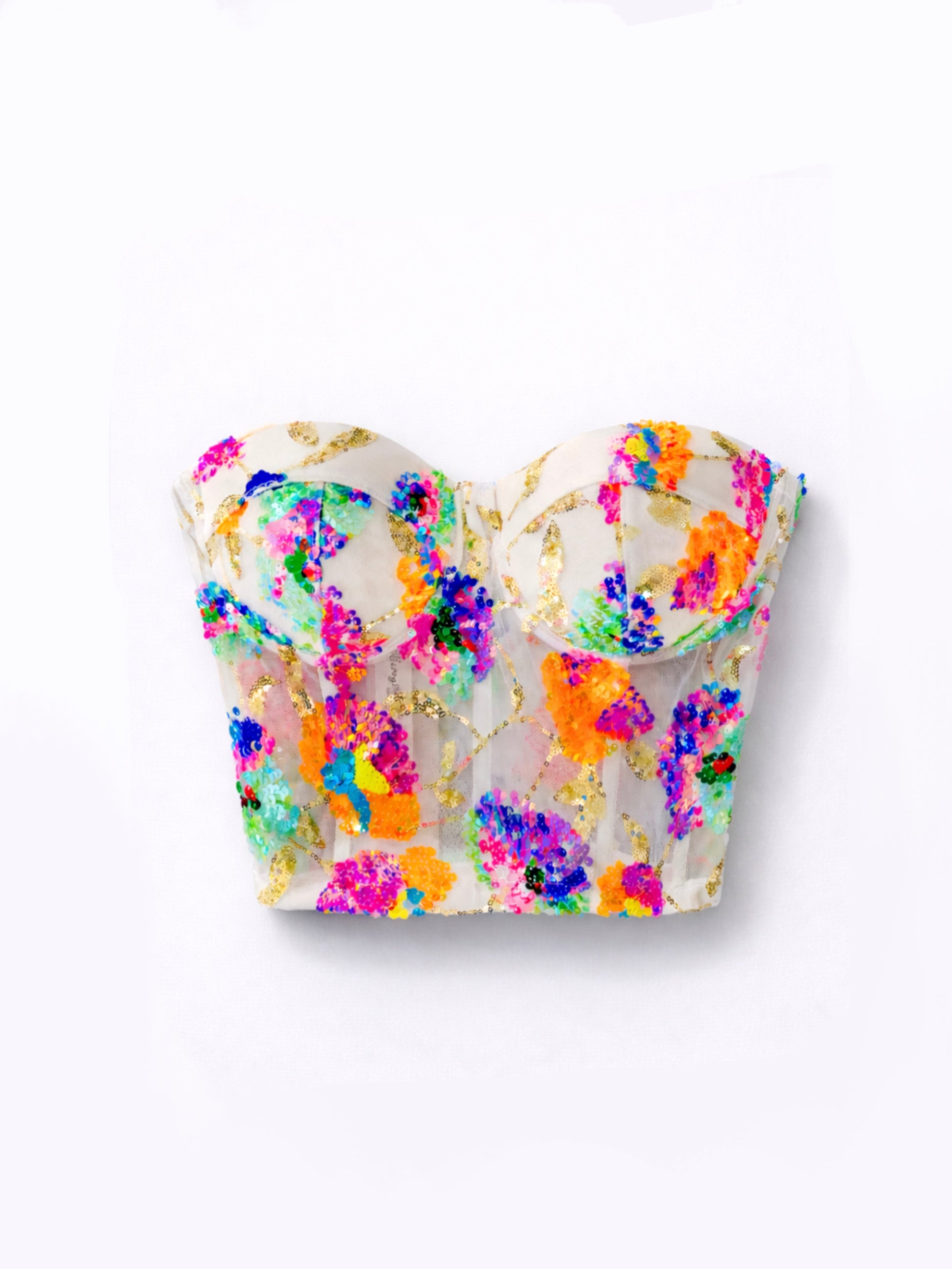 Bustier en tul óptico traslúcido con aplicaciones de lentejuelas multicolor. Ganchos en la espalda con niveles de ajuste y tirantes removibles.