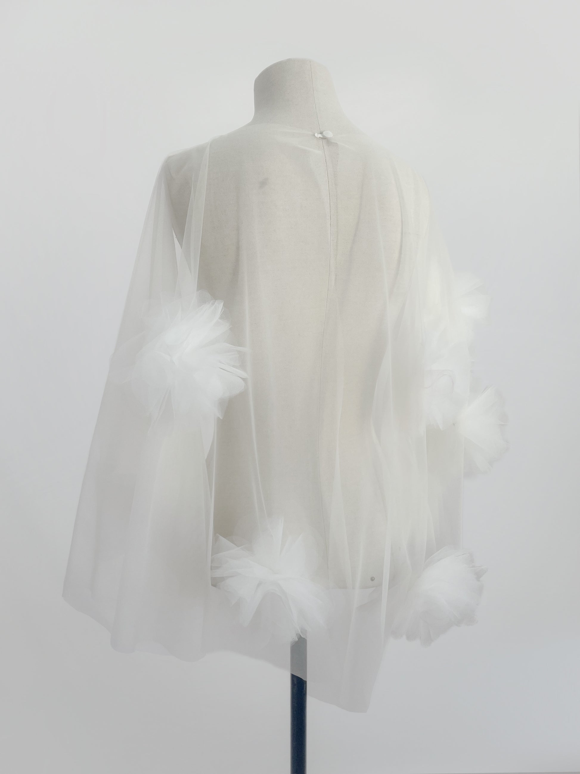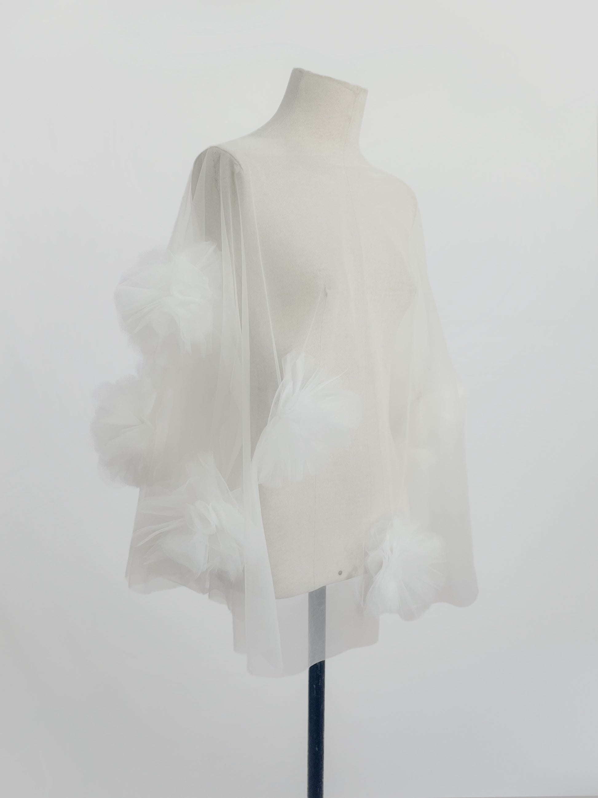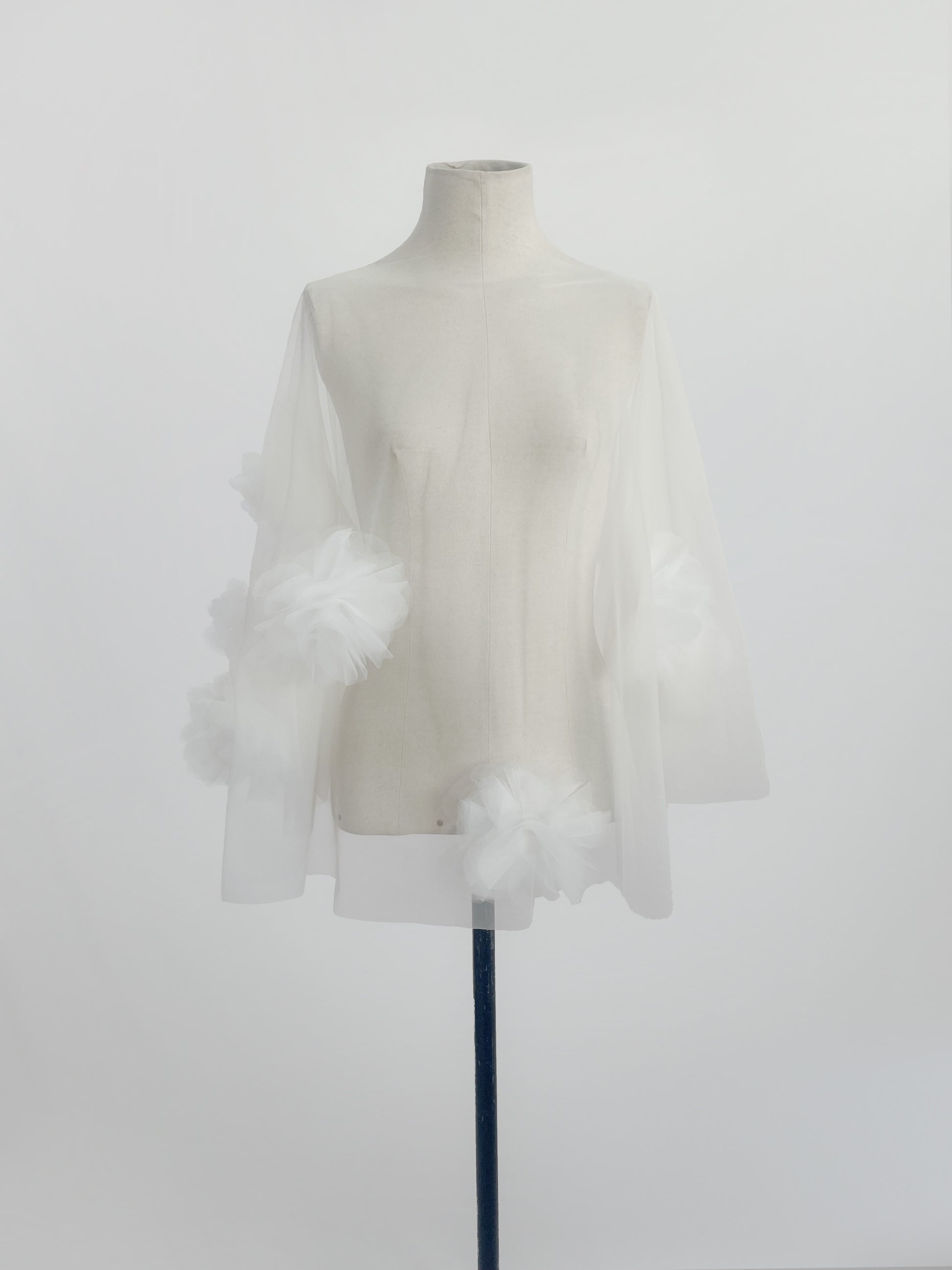 Capa unitalla de de 67 cm de largo en tul óptico, decorada con flores de tul hechas a mano. La capa lleva un broche en la espalda y puede usarse tanto al frente como al reverso, según el estilo que se desee lograr.