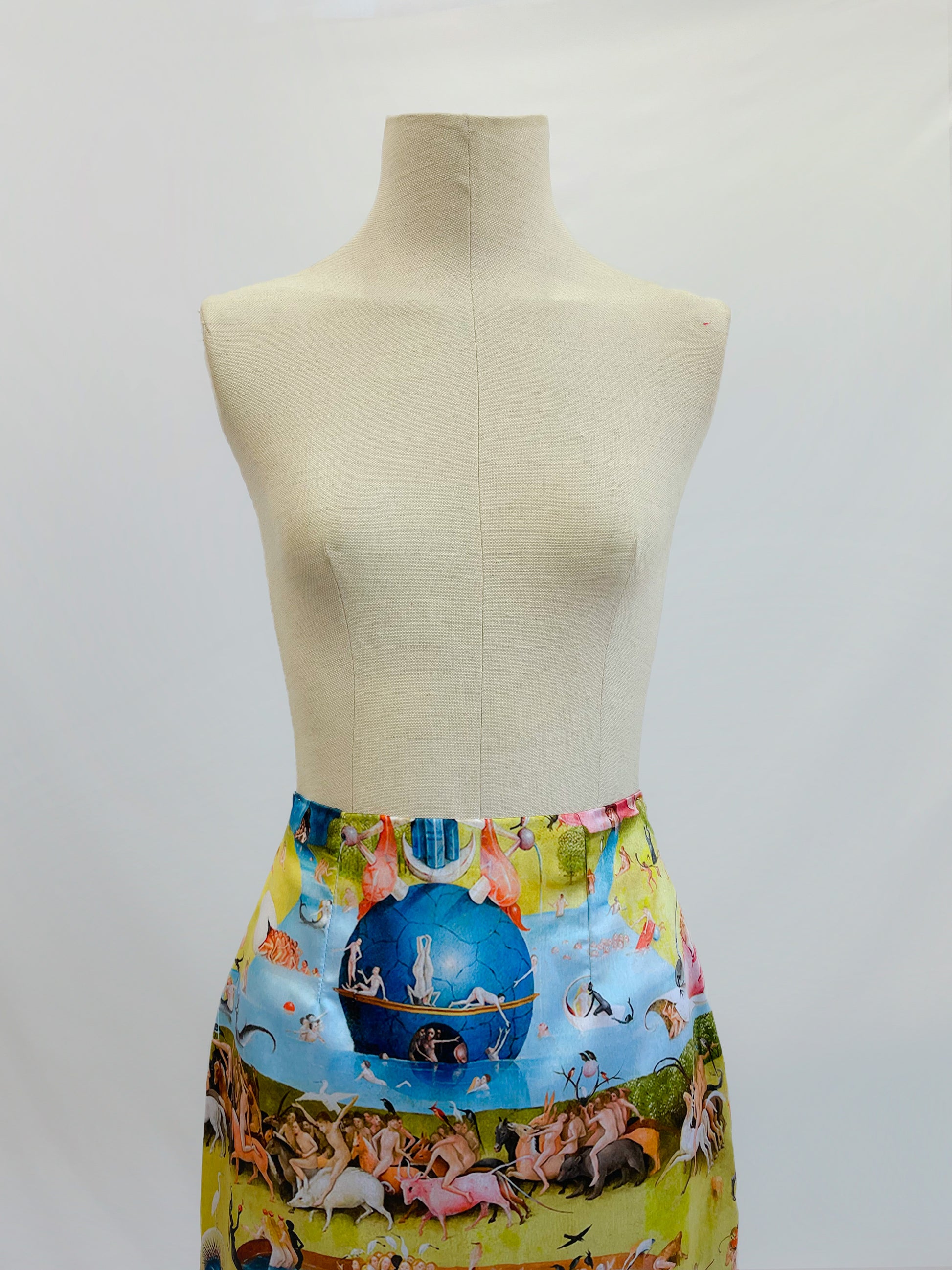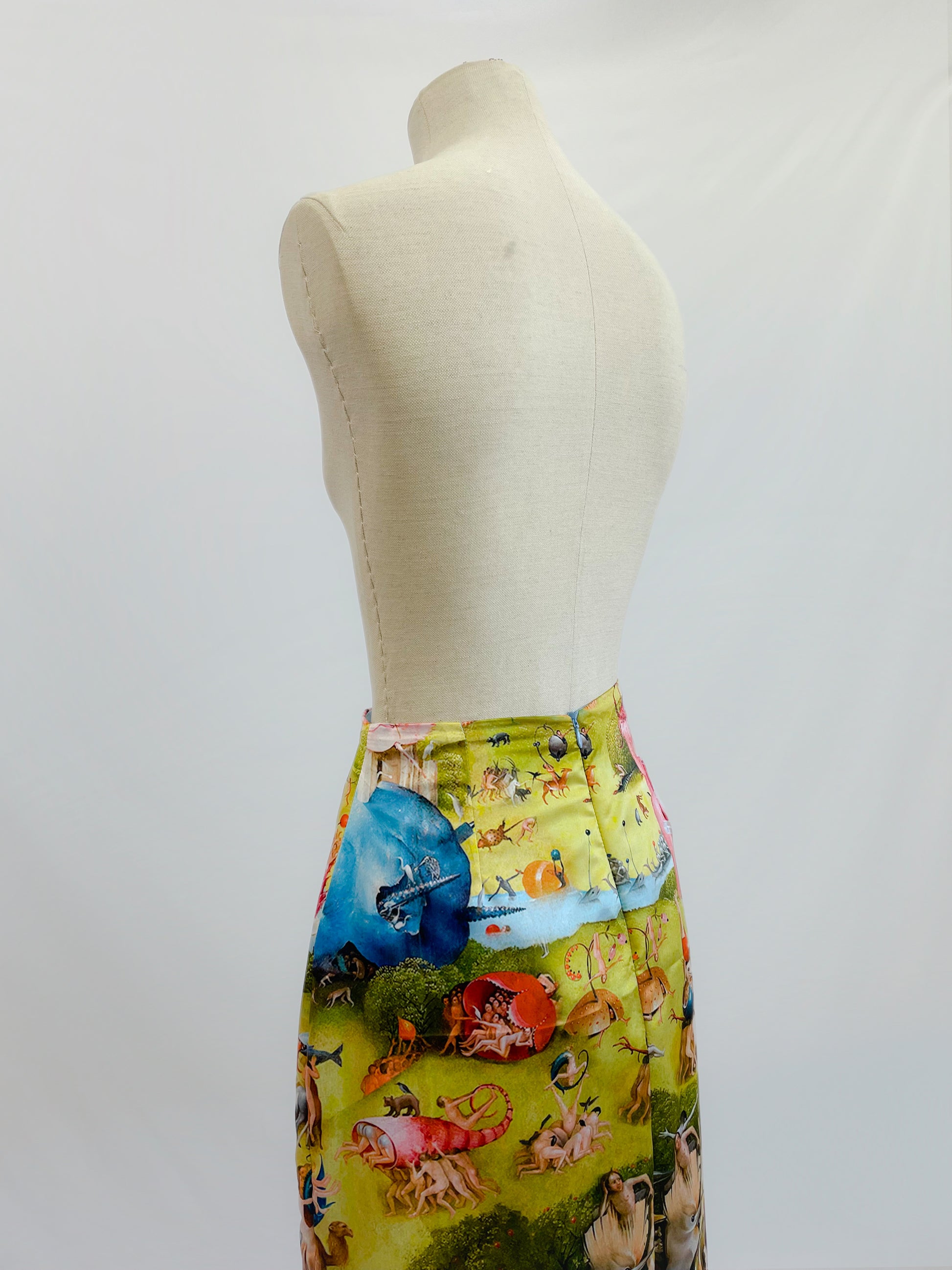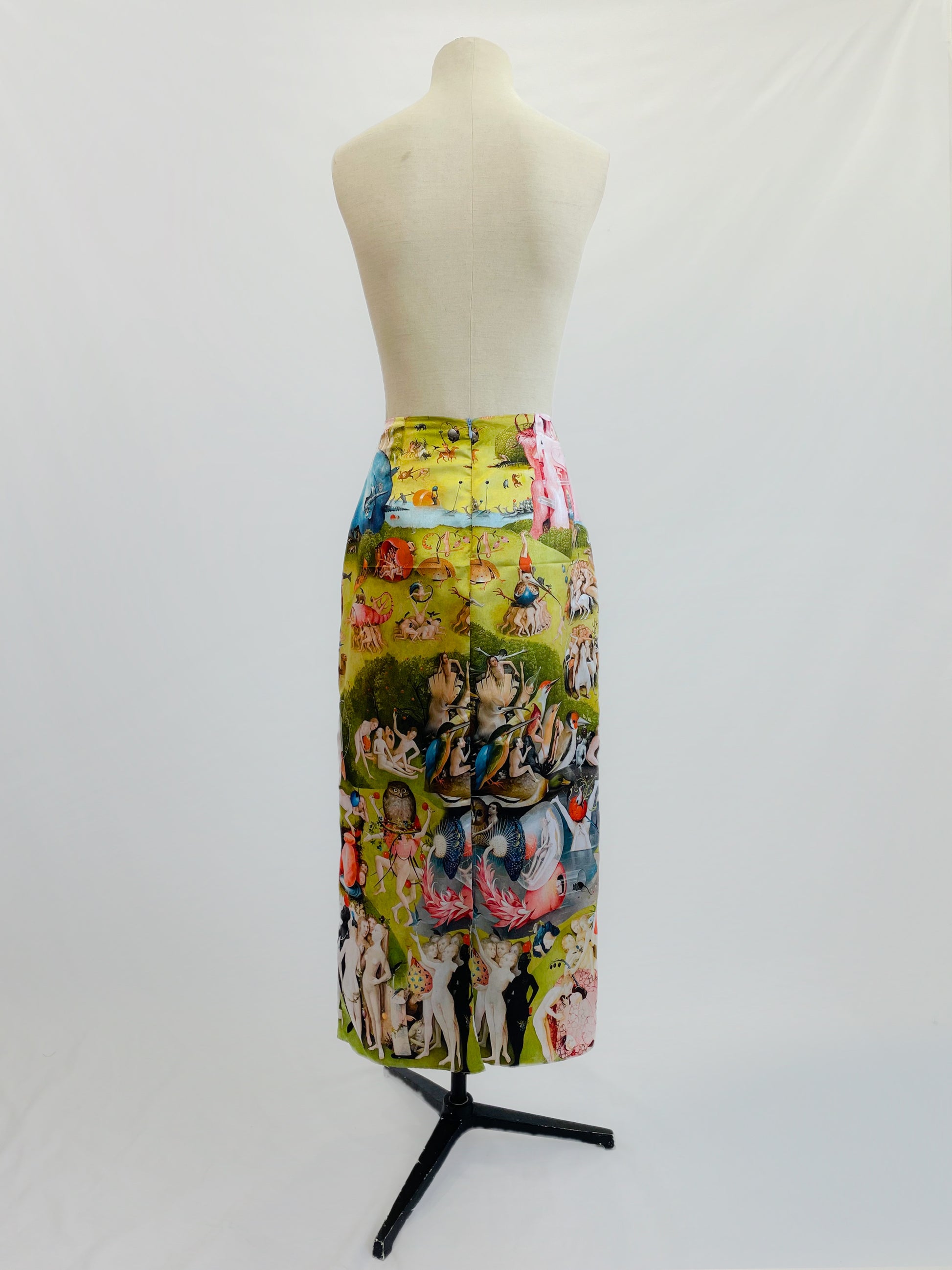 Estampado exclusivo inspirado en la pintura El el jardín de las delicias de El Bosco. Corte recto con zipper invisible en la parte trasera y abertura posterior para mayor comodidad al caminar.