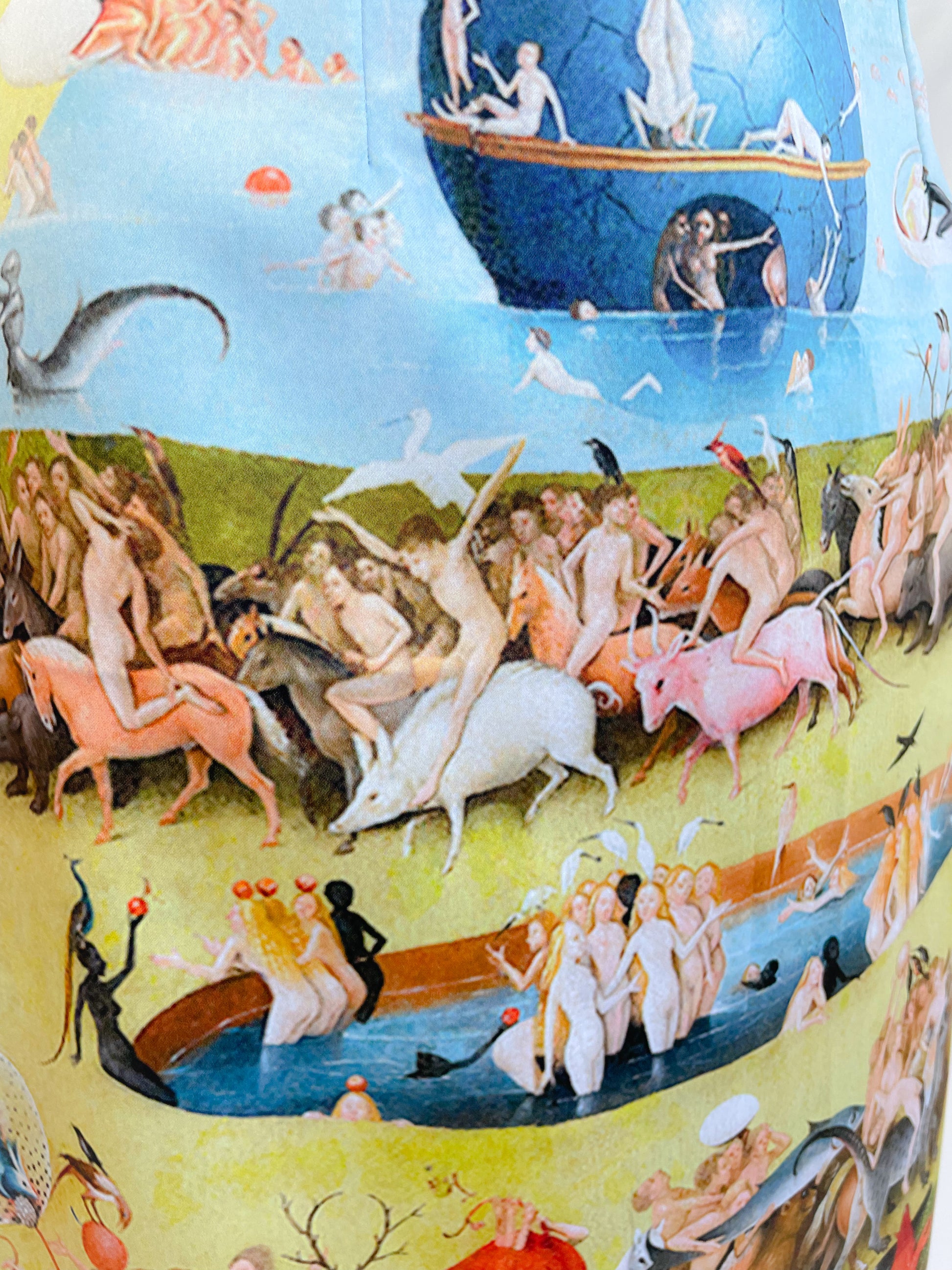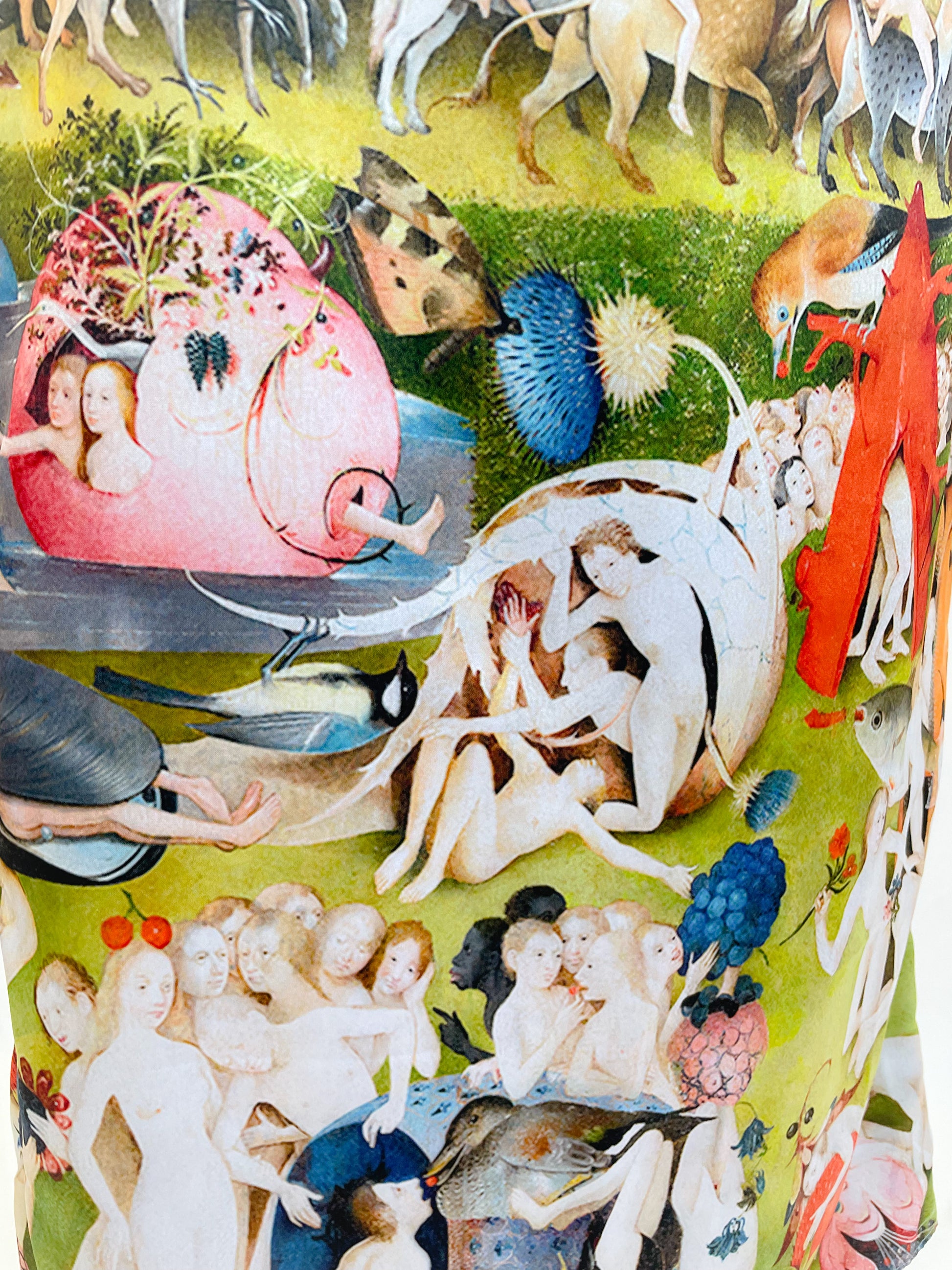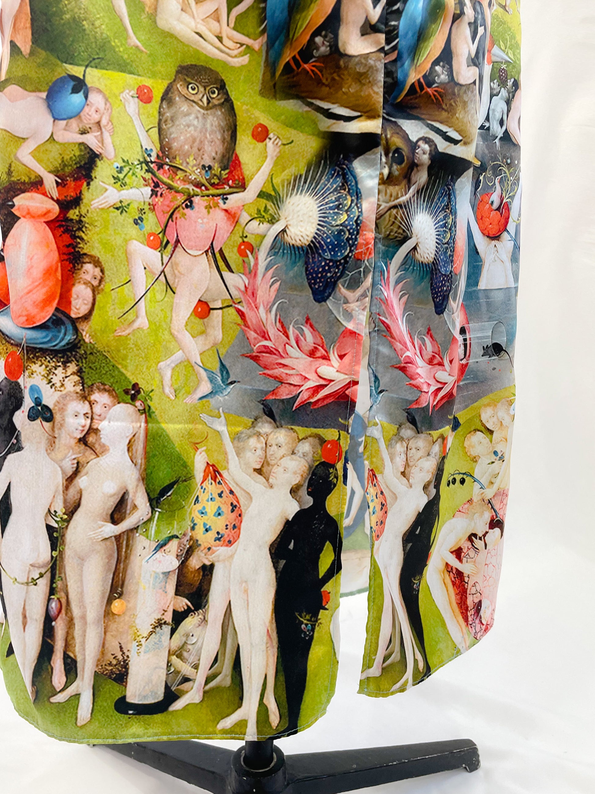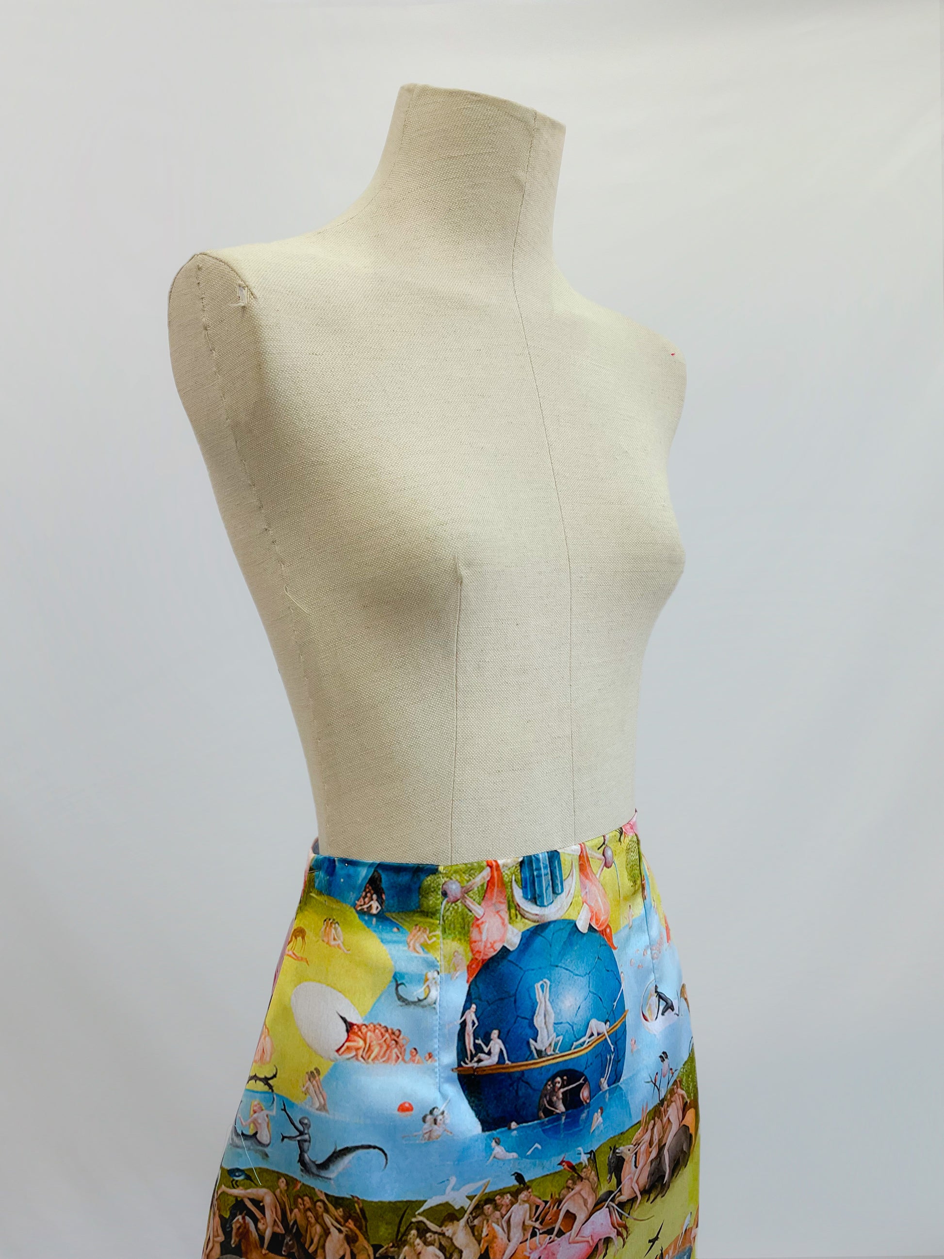 Estampado exclusivo inspirado en la pintura El el jardín de las delicias de El Bosco. Corte recto con zipper invisible en la parte trasera y abertura posterior para mayor comodidad al caminar.