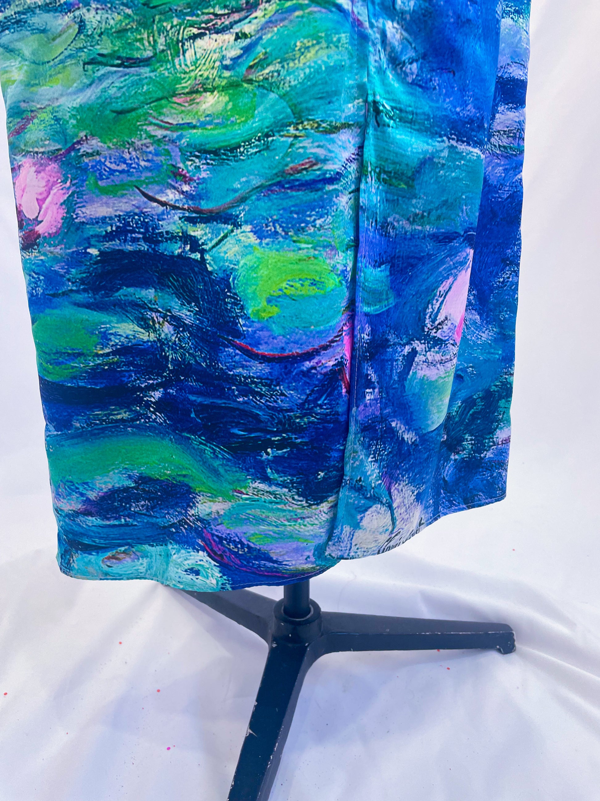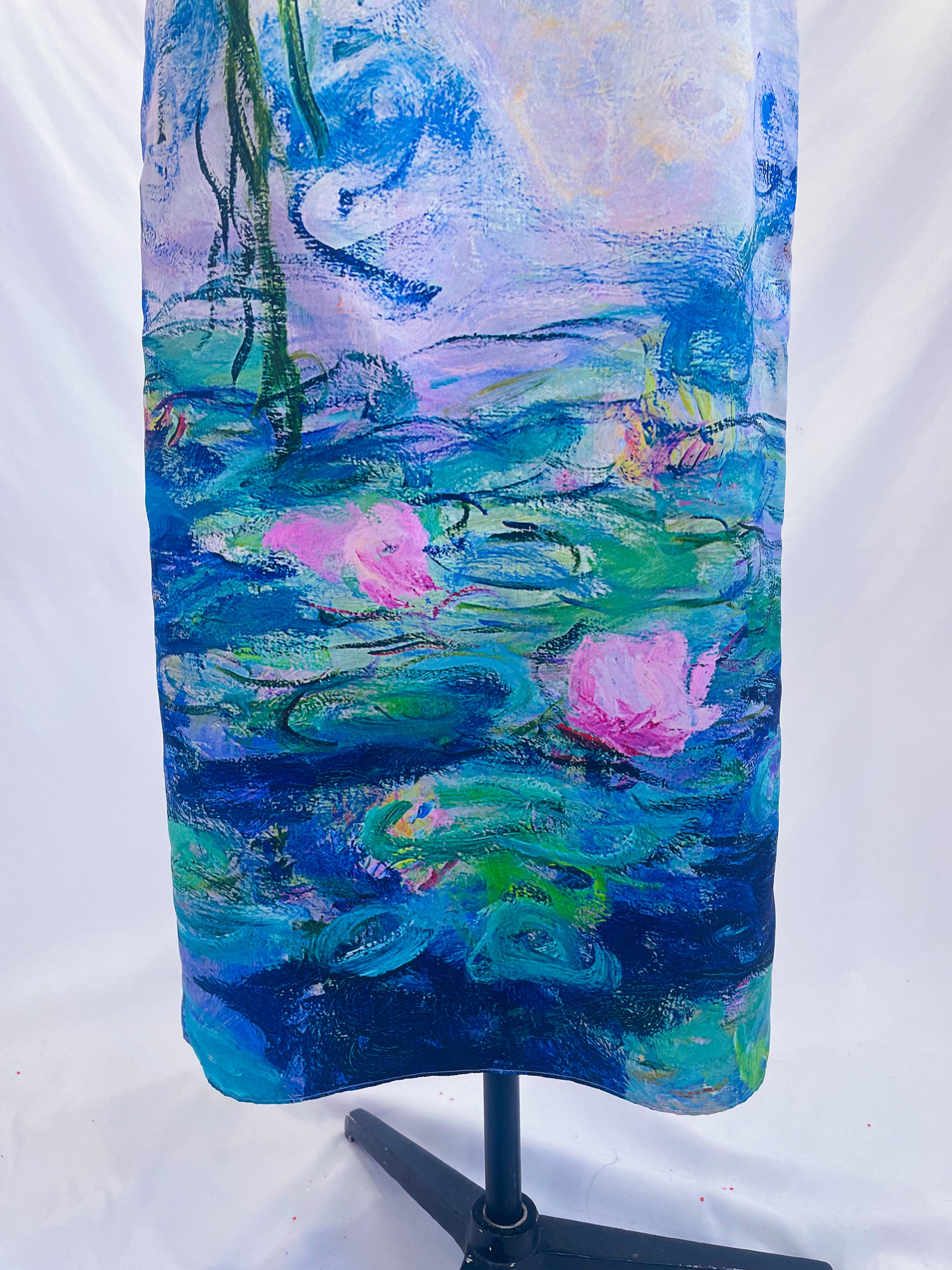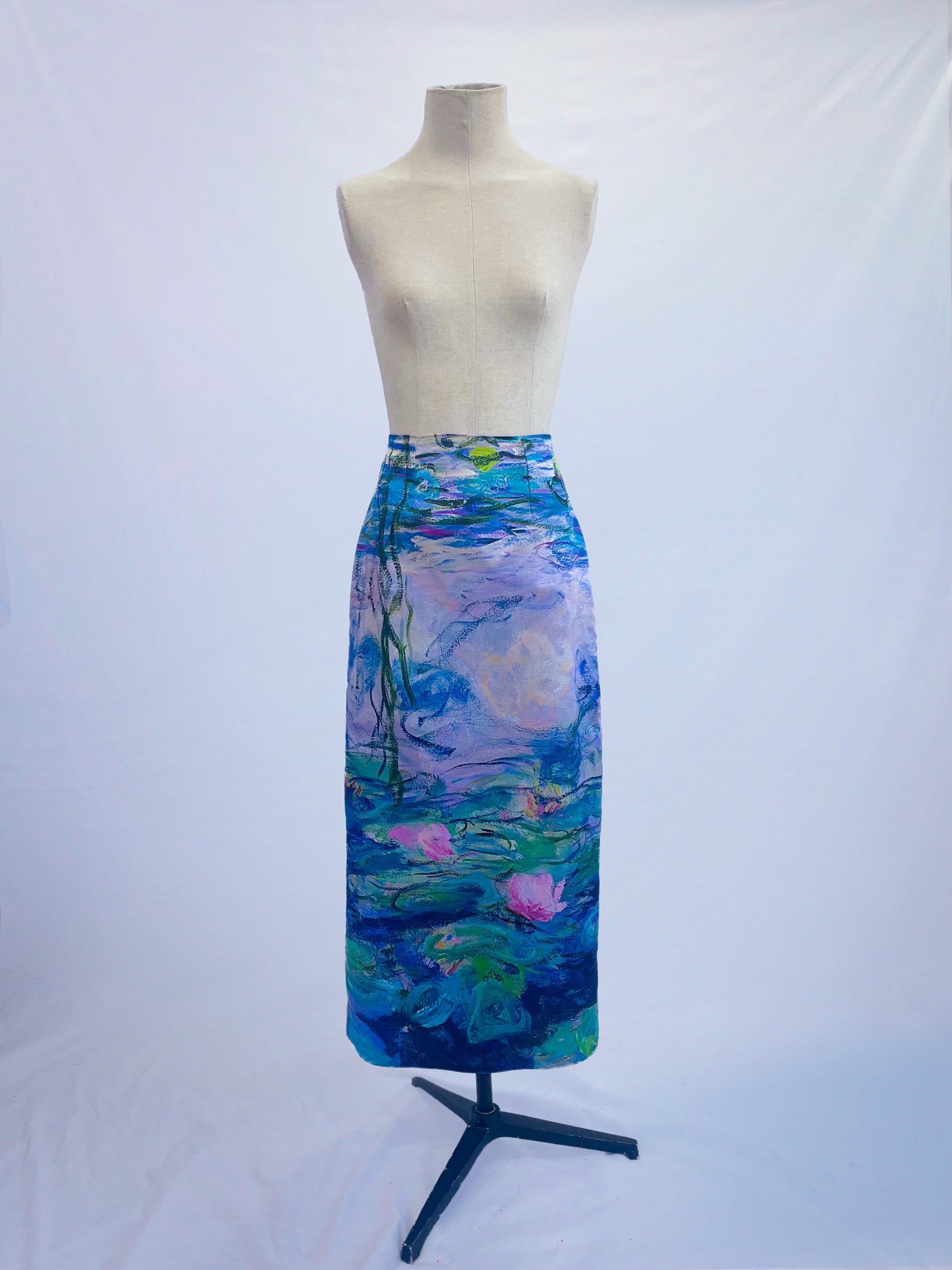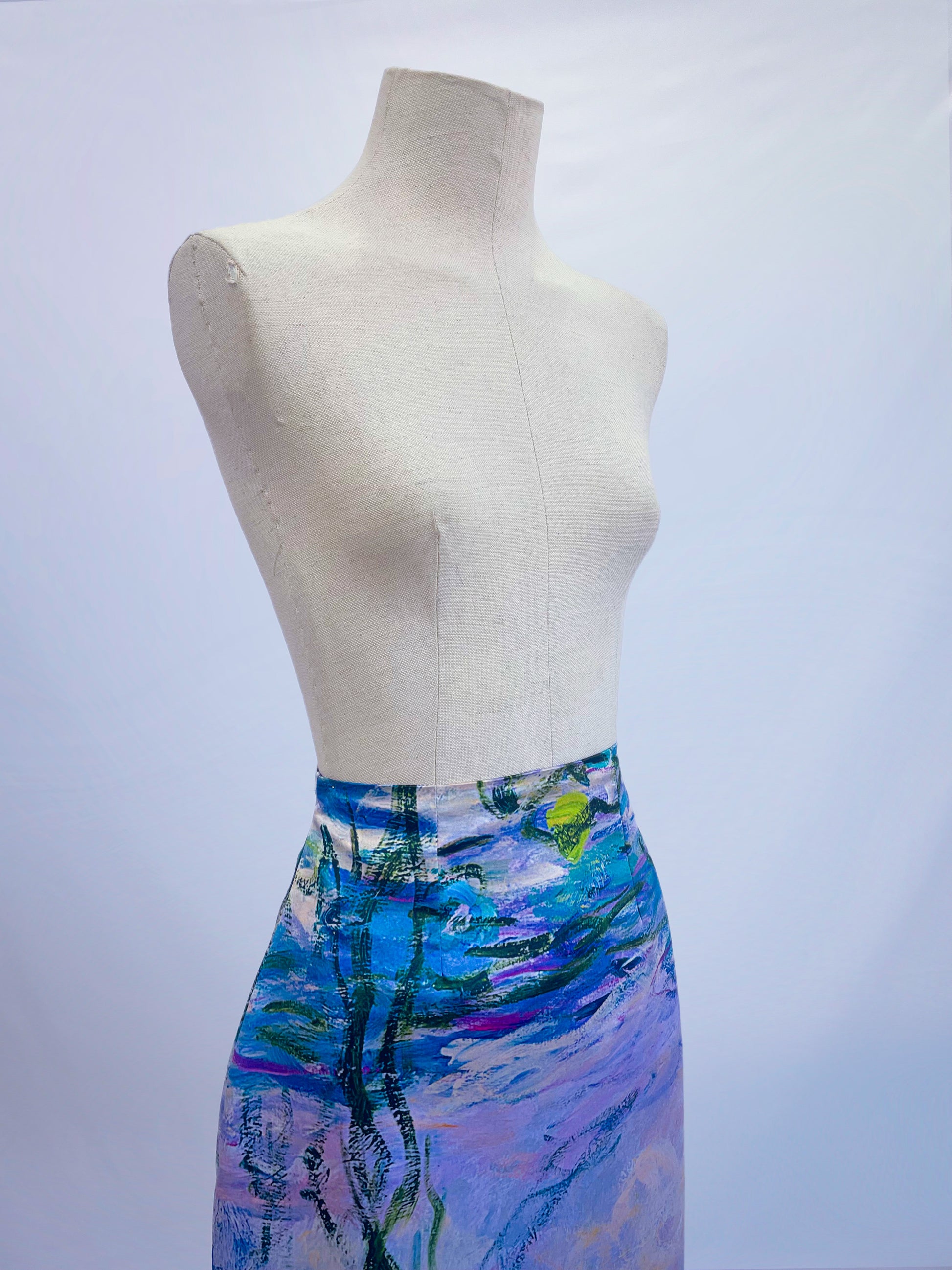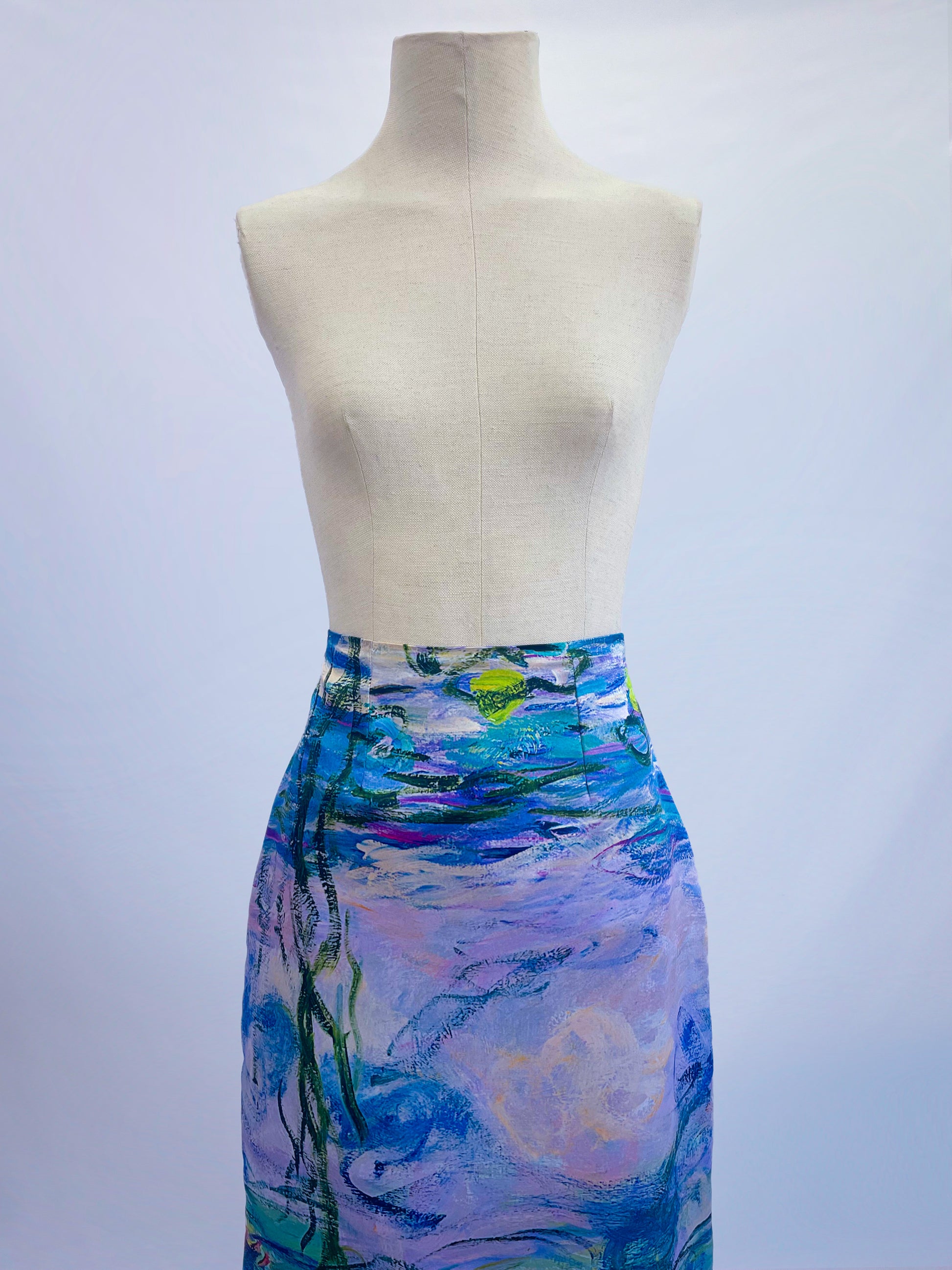 Estampado exclusivo inspirado en la pintura Nenúfares de Monet. Corte recto con zipper invisible en la parte trasera y abertura posterior para mayor comodidad al caminar.
