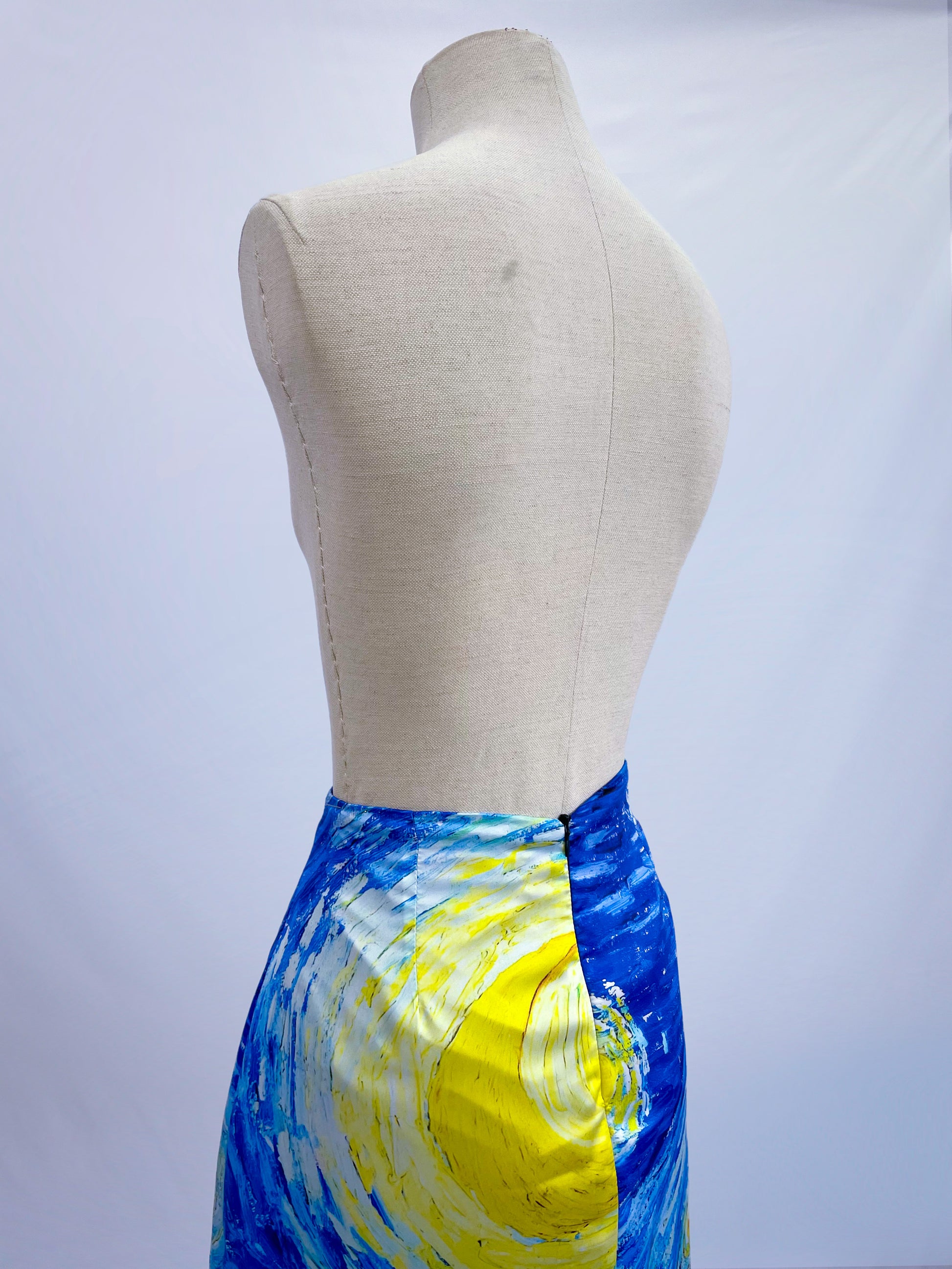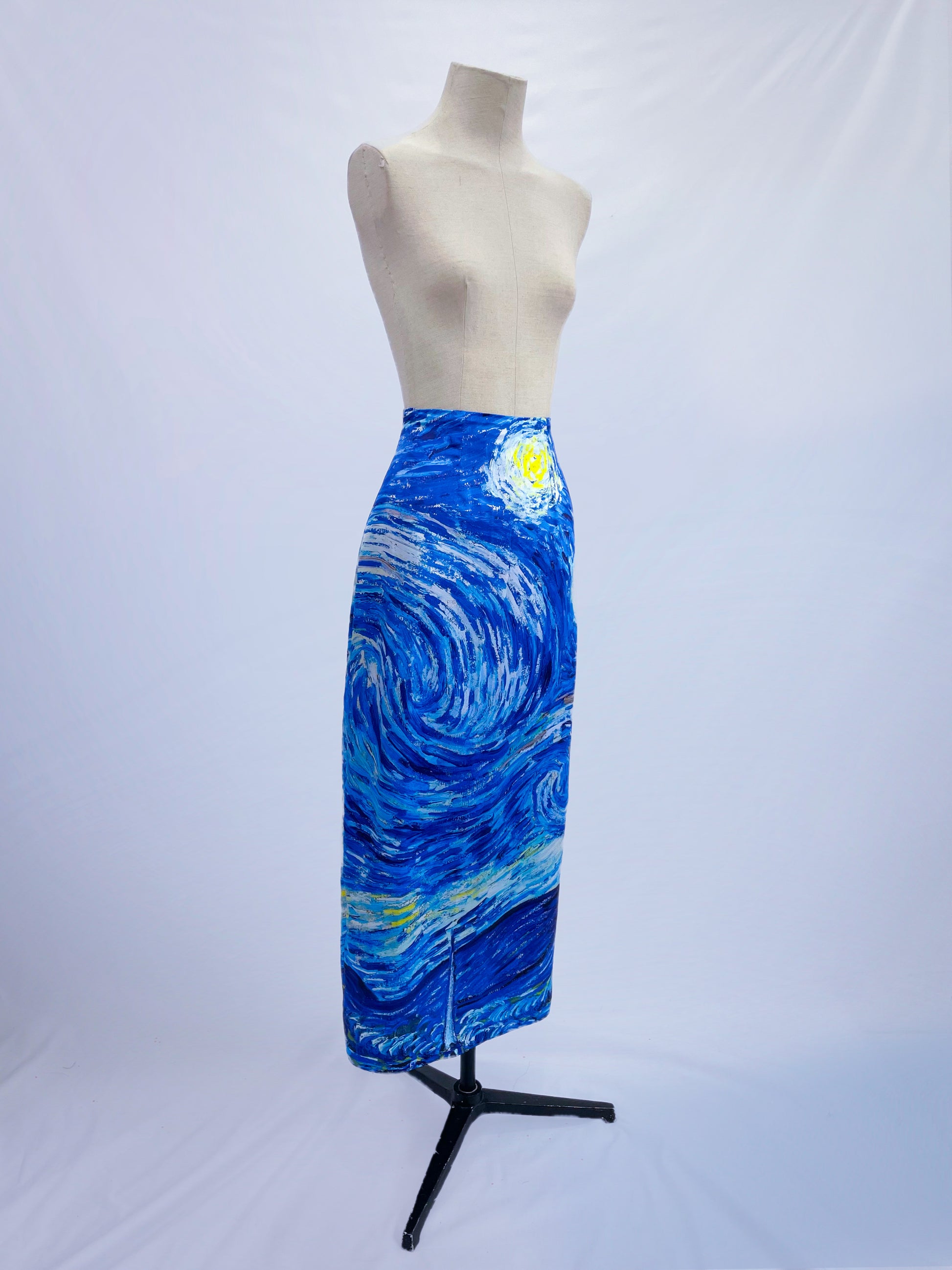 Estampado exclusivo inspirado en la pintura La noche estrellada de Van Gogh. Corte recto con zipper invisible en la parte trasera y abertura posterior para mayor comodidad al caminar.