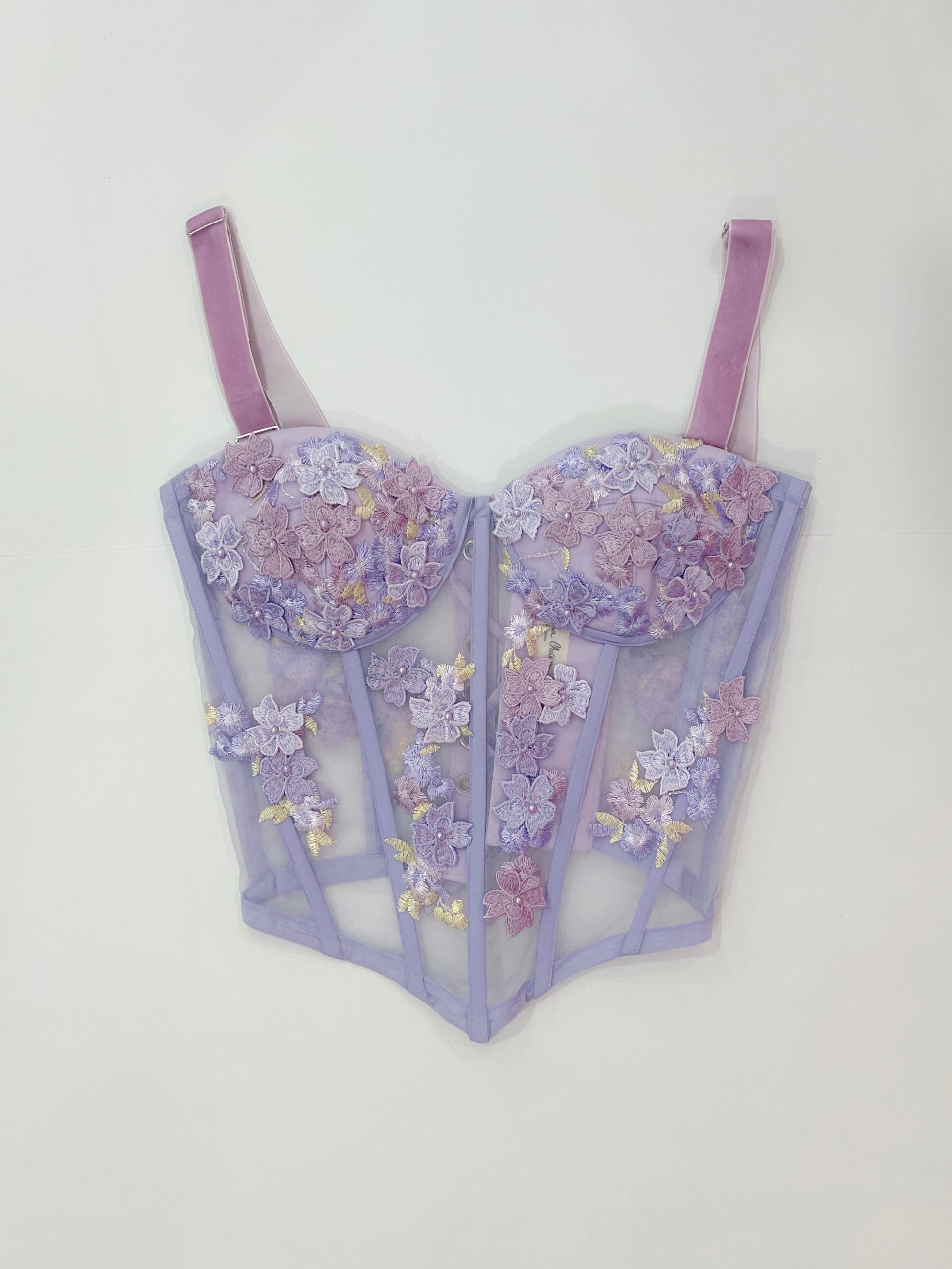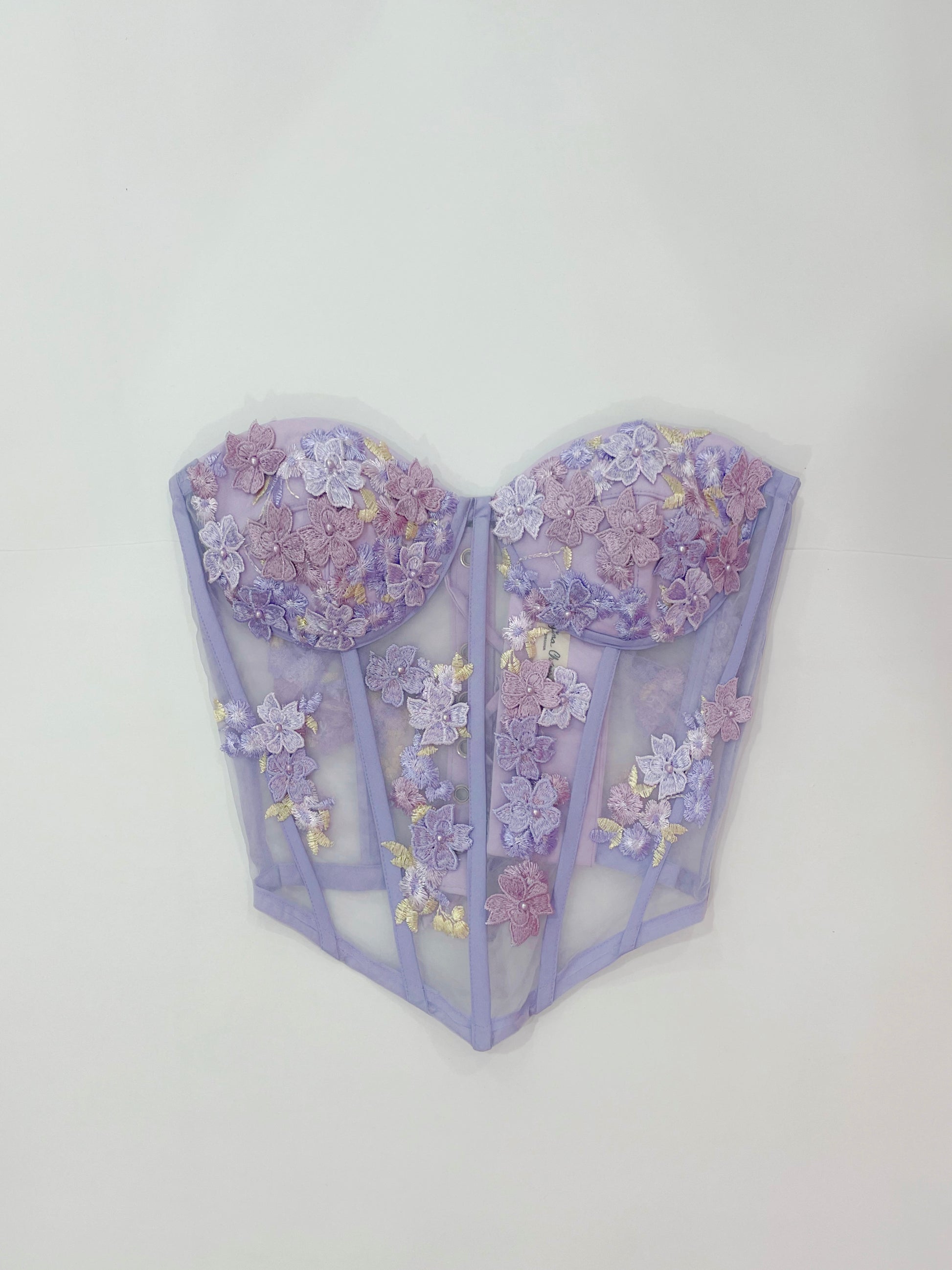 Bustier confeccionado en tul lila con bordado de hortensias. Esta es una pieza única que jamás vio la luz, diseñada y cortada hace tiempo. Cuenta con tirantes removibles, cintas ajustables en la espalda y escote en pico.