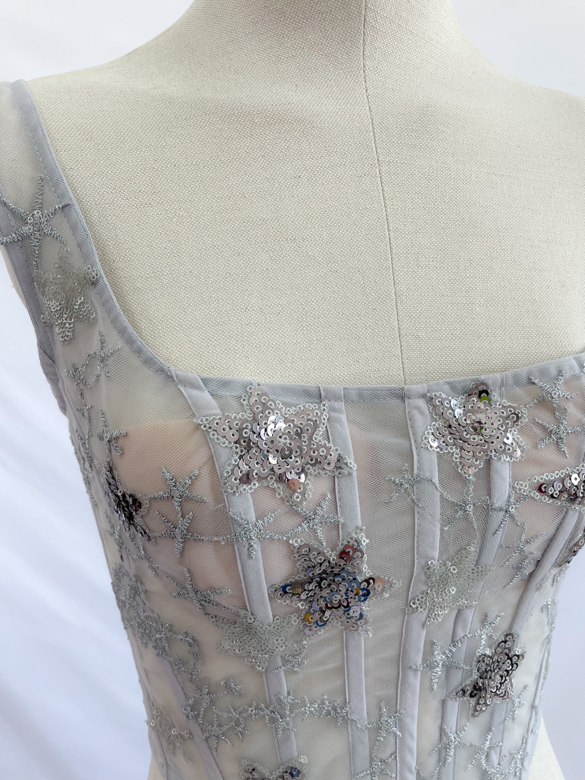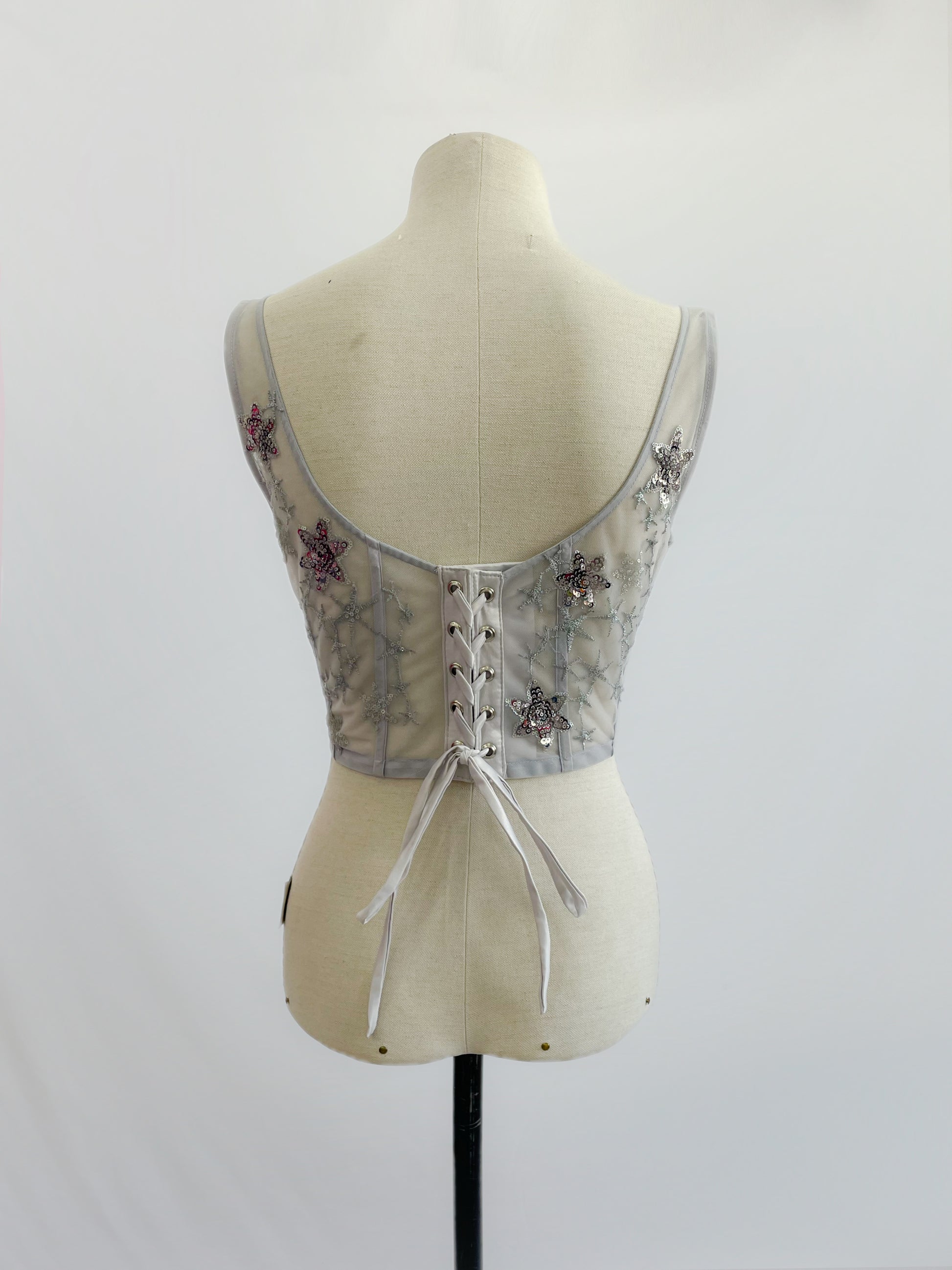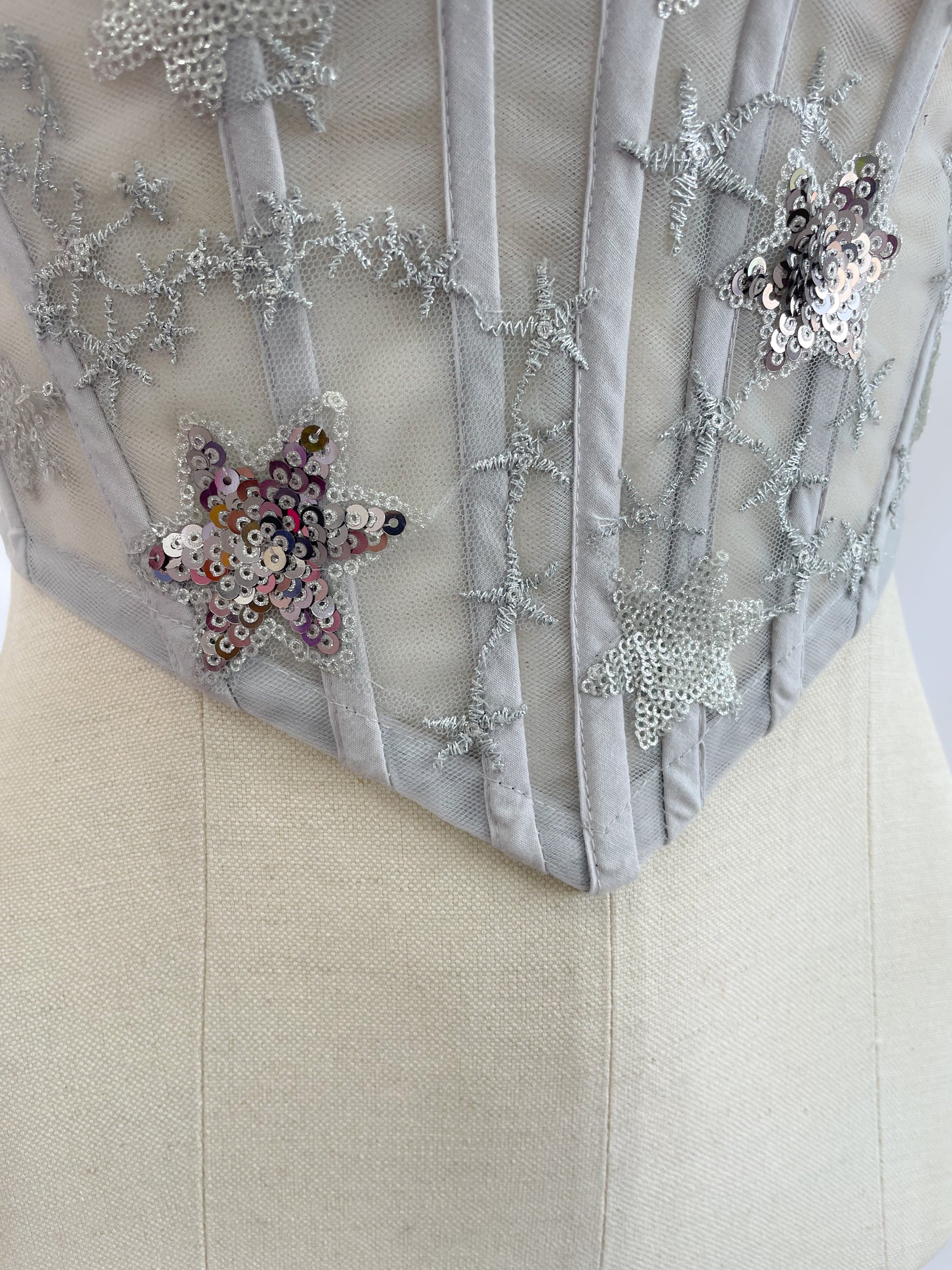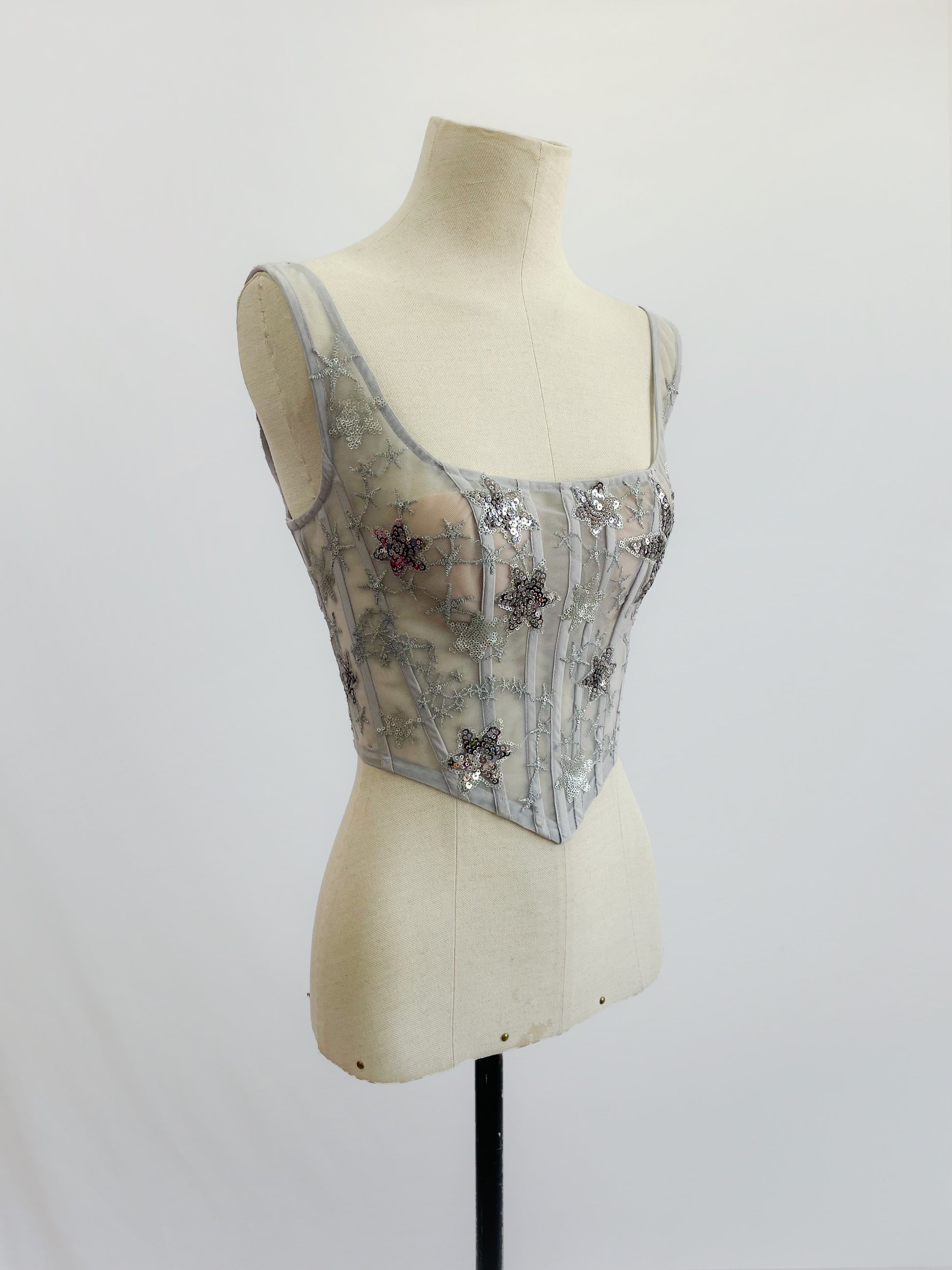 Corset de noche confeccionado en tul óptico con aplicaciones de estrellas de lentejuelas bordadas a mano.