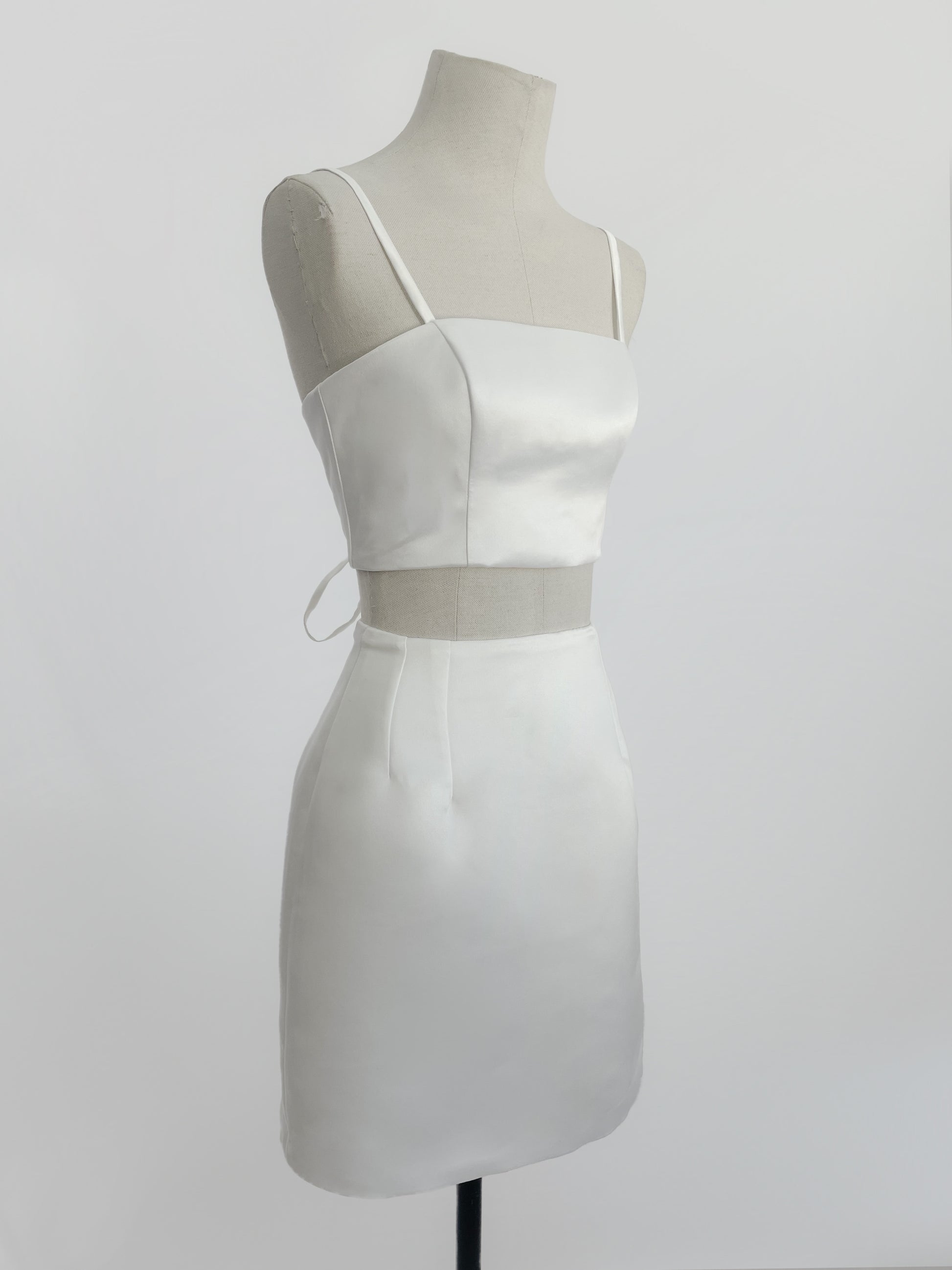 El conjunto se completa con un top de tirantes delgados y ajustables y una falda en línea A de 45 cm de largo, que aporta un aire ligero y femenino al set.