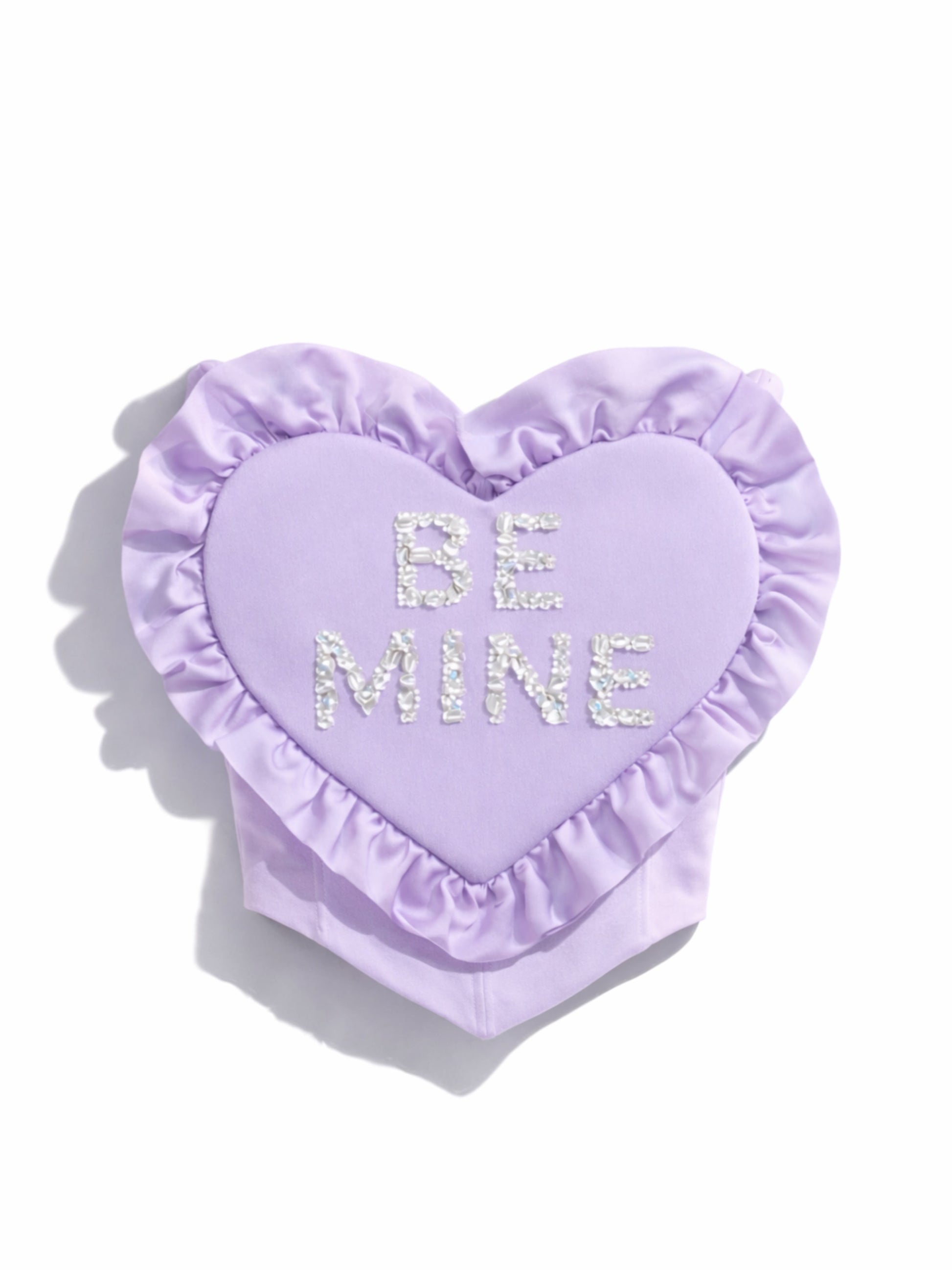 El corazón es desmontable y funciona como bolsa, sujetándose al top mediante botones para mantenerse firme al usarlo como prenda. Al retirarse, puede utilizarse como bolsa cross body. Las correas de la bolsa pueden ocultarse completamente cuando el corazón está colocado sobre el top, conservando un acabado limpio y pulido.