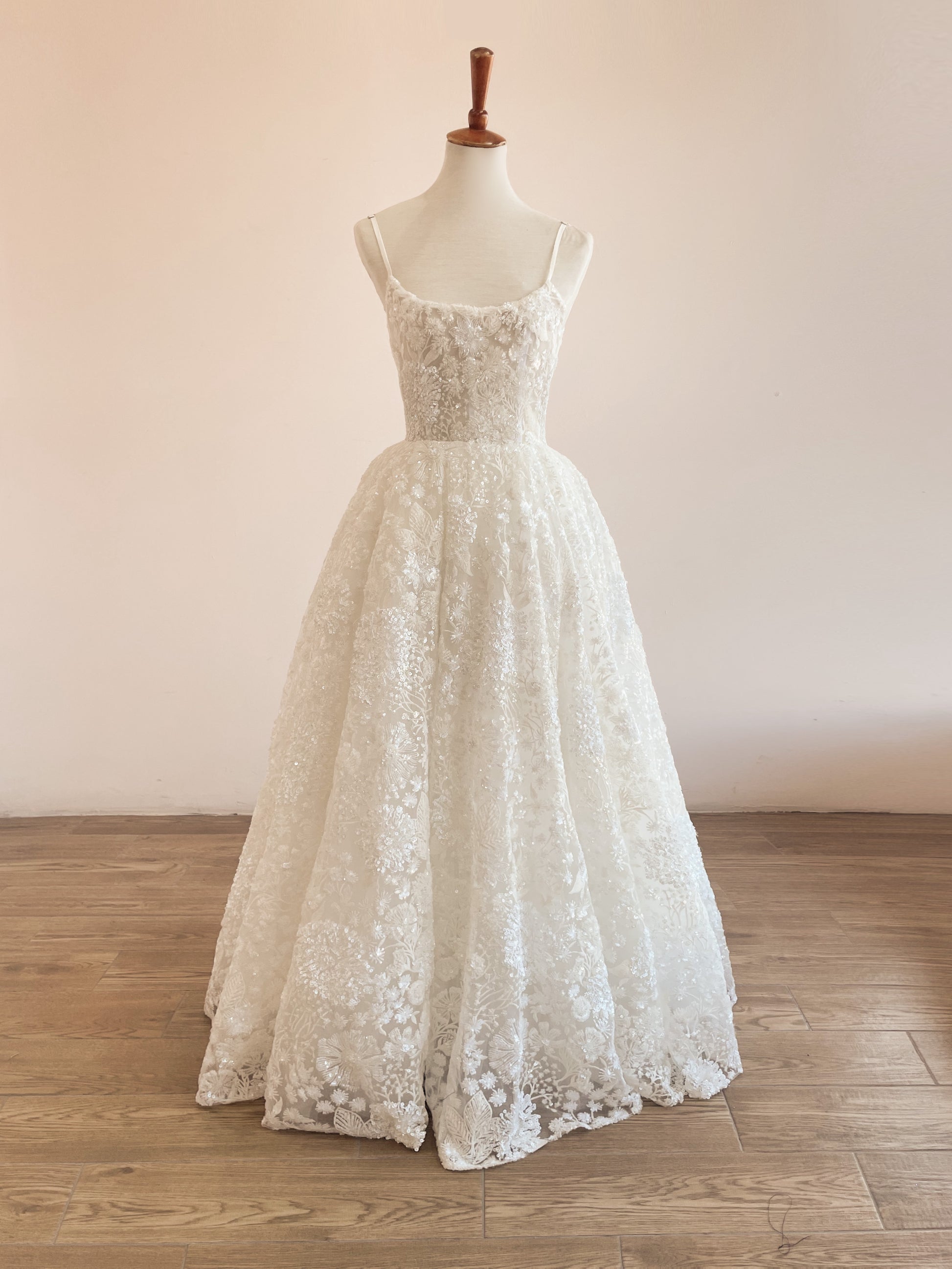 Vestido largo de noche confeccionado en tul bordado con lentejuelas, sobre base de charmeusse y tul.