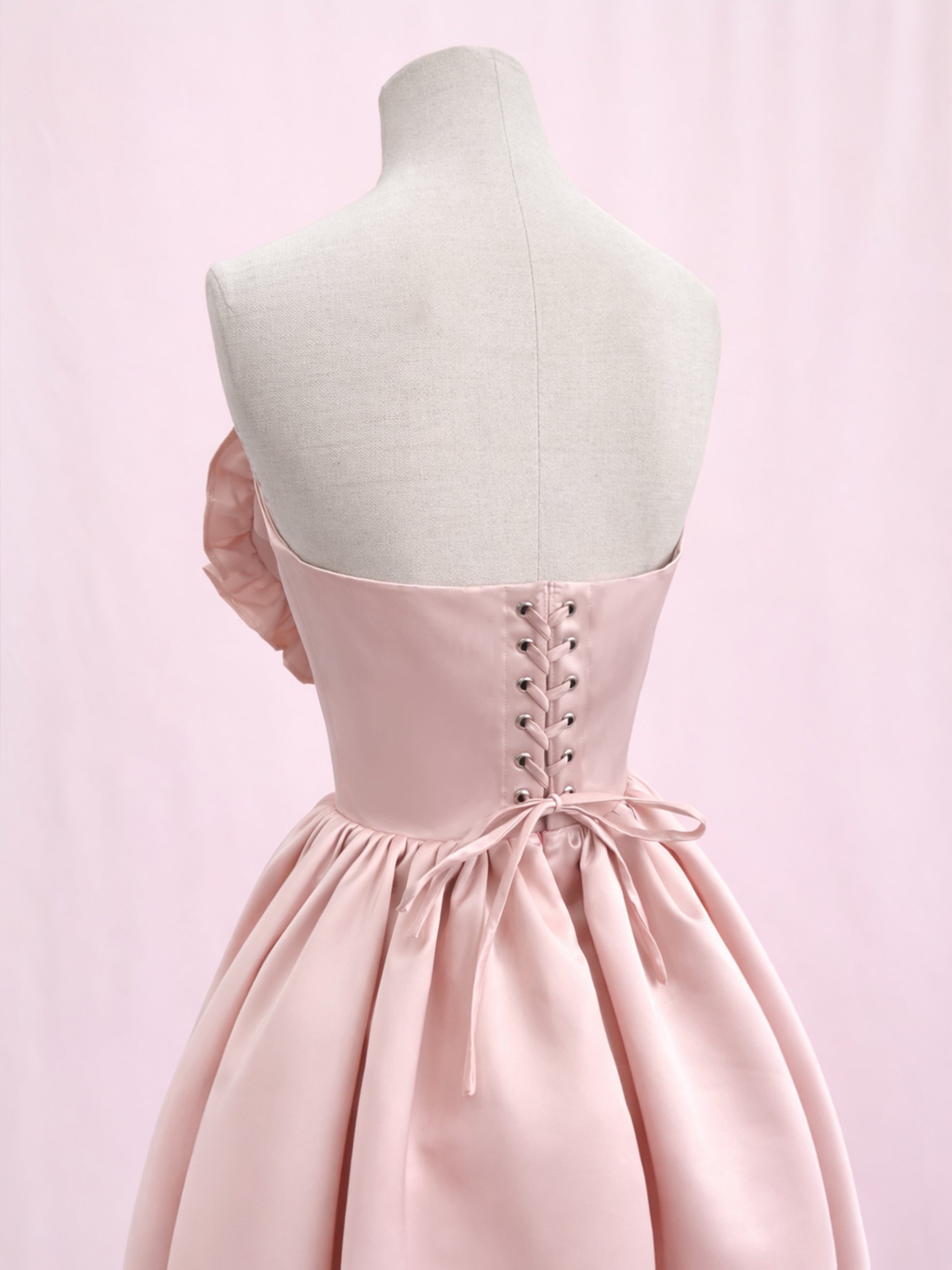 La falda tiene caída suave y volumen delicado, equilibrando la estructura del corset y manteniendo una estética romántica y limpia.